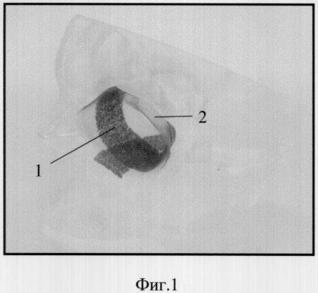 Проведена пластическая операция – восстановление вертлужной впадины с использованием предлагаемого имплантата, который, как в примере 1, содержит пластину из пористого никелида титана, размерами и формой адекватную вертлужной впадине в норме. Второй компонент имплантата – сетка из никелид-титановой проволоки диаметра 50 мкм, с ячейкой 500 мкм в текстильном исполнении (3 фиг.4).
