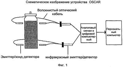 В приборе OSCAR для определения характеристик препарата предварительно перемешанной суспензии используют изменения пропускания света в зависимости от времени (схематическое изображение прибора приведено на Фиг.1). Прибор состоит из тестового узла с двумя головками. Головка с левой стороны прибора используется для разбавленных суспензий, а правая – для концентрированных суспензий. Селекторный переключатель, вмонтированный между двумя тестовыми головками, используется для изменения выбора концентрации. Выходной сигнал с выбранной тестовой головки направляется во вмонтированный в прибор индикатор напряжения и на компьютер для регистрации показаний. Аналоговые сигналы, поступающие с фотодетекторов, оцифровываются и значения сохраняются в файлах с данными, а затем обрабатываются с использованием соответствующего пакета программного обеспечения. В приборе имеются два вмонтированных индикатора напряжения, один – для верхнего, а другой – для нижнего фотодетектора. Верхний и нижний фотодетекторы регулируются по высоте, и имеется индикатор считывания положения для показа установленной высоты для каждого теста.