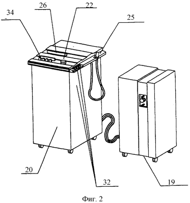 Аппарат для гипо-гиперокситерапии, изображенный на фиг.2 и 3, состоит из безмасляного мембранного компрессора 19, металлического корпуса 20, газоразделительного мембранного элемента 21, маховика регулятора газовой гипоксическои смеси (ГГС) 22, увлажнителя 23, ресивера 24, маски с обратным клапаном 25, пульсометра с датчиком кислорода 26, теплоохладителя со сборником конденсатора 27, блока автоматического слива конденсата 28, вентиля регулятора расхода газовой смеси 29, регулируемого жиклера 30, предохранительного клапана 31, светового сигнала 32, звукового сигнала 33 и пульта управления 34, а также системы автоматизированной подачи гипоксической и гипероксических смесей в дыхательную маску (фиг.4).
