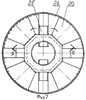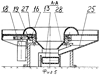 Затем отходы поступают на горизонтальный сортировочный конвейер 14 (фиг.5), образованный вращающимся перфорированным круглым столом 15, установленным на вращающейся части поворотной роликовой опоры 16. Неподвижная часть поворотной роликовой опоры 16 установлена на станине 17 (фиг.6), на которой в свою очередь установлены четыре механических привода 18 с катками 19, образующими фрикционные передачи с наружными торцами поворотной роликовой опоры 16, четыре профильных неподвижных стола 20 (фиг.8), имеющих горизонтальный участок 21 для защиты от отходов механических приводов 18 и две наклонных отбортовки 22 для очистки отверстий 23 вращающегося перфорированного круглого стола. На профильных неподвижных столах 20 установлены две коротких наклонных обечайки 24 и две длинных наклонных обечайки 25 для направления отсева на наклонный ленточный конвейер 13, неподвижная вертикальная стенка 26. В центре на станине 17 установлены неподвижный защитный тороидальный кожух 27, желоб 28 для сброса маленьких пакетов с пищевыми отходами и крупных фракций пищевых отходов на наклонный ленточный конвейер 13. Сбрасыватель 29 в виде прямой планки закреплен на неподвижной вертикальной стенке 26 и неподвижном защитном тороидальном кожухе 27.