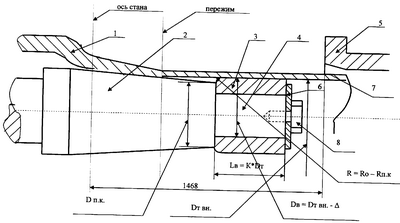 Передельная труба 1 подавалась на передний стол стана ХПТ 450, в которую вводилась оправка 2, передний конец оправки 2 выполнен в виде хвостовика 4 диаметром 200±0,2 мм и длиной 650±1,0 мм. На хвостовик оправки надевали цилиндрическую вставку наружным диаметром 314,5±0,1 мм, что соответствует п.3 формулы изобретения, а именно Dв=Dт вн.- или 325-2S- =325-10-0,5=314,5 мм, длина которой на 3,0 мм короче хвостовика (Lв=К·Dт=647 мм). Внутренний диаметр цилиндрической втулки выполнили со скользящей посадкой, т.е. цилиндрическая втулка имела две степени свободы (вращательную и поступательную). Цилиндрическую вставку фиксировали с торца хвостовика шайбой 6 и крепежным винтом 8, который вкручивали по оси хвостовика на глубину 10-15 мм. Передний торец цилиндрической вставки, по ходу прокатки, выполняли по радиусу, значение которого определяли из выражения R=Ro-Rп.к., что соответствовало п.4 формулы изобретения. Цилиндрическая вставка была изготовлена из чугунной отливки с шаровидным графитом. После прокатки каждой трубы на цилиндрическую втулку и сопрягающиеся с ней части наносилась смазка из смеси машинного масла, графита и поваренной соли.