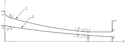 Развертка профиля внешнего рабочего инструмента 1 и профиль внутреннего рабочего инструмента 2 выполнены в форме кривых. Профиль внешнего и внутреннего рабочего инструмента предлагаемой калибровки состоит из следующих участков: редуцирования (АВ и А В соответственно), обжимного (ВС и В С соответственно) и калибрующего (CD и C D соответственно); т.С и С соответствуют пережиму, т.е. переходу от обжимного участка к калибровочному.