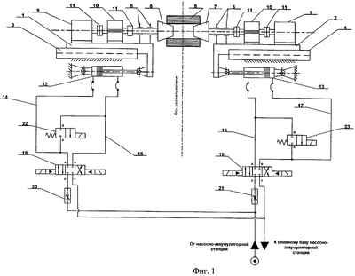 Возвратно-поступательное движение кареток 1 и 2 осуществляется от гидропривода с помощью гидроцилиндров 12 и 13, штоки которых связаны с каретками. Поршневые и штоковые полости гидроцилиндров 12 и 13 соединены трубопроводами 14, 15, 16, 17 через четырехлинейные распределители 18 и 19 управления гидроцилиндрами и регуляторы расхода 20 и 21 с насосно-аккумуляторной станцией (условно не показана). Трубопроводами 14, 15 и 16, 17 через двухпозиционные гидрораспределители центрирования 22 и 23 соединены между собой, образуя замкнутый гидравлический контур, включающий поршневую и штоковую полости гидроцилиндров 12, 13 и гидрораспределители центрирования 22, 23.