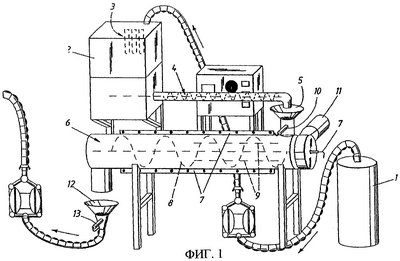 На фиг.3 показан вариант реализации подающего средства в виде лопаток 14, установленных на центральном сердечнике 15 и отходящих от него. Лопатки снабжены скребками 16. Каждая лопатка образует угол с направлением подачи. Различные лопатки могут иметь углы различной величины. Подающее средство, показанное на фиг.3, может заменить червячное подающее средство, показанное на фиг.1.