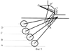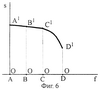 При перемещении колеса с позиции А до позиции D происходит изменение длины пружины от размера ОА1 до размера OD1 по нелинейному закону (фиг.6, где: f – перемещение колеса, s – деформация пружины) за счет движения рычага по нелинейному профилю копира. Причем максимальной длине пружины (размер OA1) соответствует минимальное усилие ее сжатия, а минимальной длине (размер OD1) – максимальное усилие сжатия.