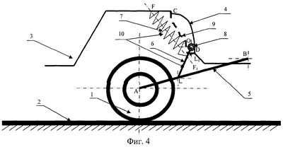 Изобретение поясняется фигурой 4, на которой изображены: 5 – балансир; 6 – рычаг, шарнирно соединенный с балансиром 5 в точке L; 8 – ролик, закрепленный на рычаге в точке L1 и перемещаемый по поверхности копира с расчетным профилем опорной поверхности 4; 10 – упругий металлический элемент в виде пружины сжатия 7, одним концом закрепленной на рычаге 6; 9 – эластичный защитный кожух.