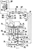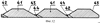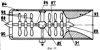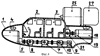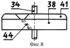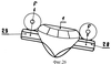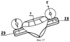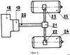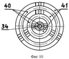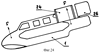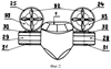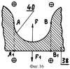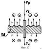 Аналогично возникает подъемная сила и на концентрических полукруглых впадинах 40 дисков 38, 39. Воздушный поток движется вдоль концентрической полукруглой впадины и обтекает наружную сферическую и нижнюю гладкую поверхности с одинаковой скоростью. (фиг.16). Так, как дуга АВ больше отрезка А1В1 при одной и той длине обеих поверхностей, то и площадь верхней поверхности будет больше площади нижней поверхности. Следовательно разрежение на верхней поверхности будет больше, а на нижней поверхности меньше. Отсюда сила F, действующая на верхнюю поверхность, будет больше силы F1, действующей на нижнюю поверхность. Разница этих сил будет подъемной силой концентрической полукруглой впадины. При прохождении воздушного потока, обтекающего верхнюю поверхность концентрического полукруглого гребня, в момент его прохождения по заднему скосу 43 часть воздушного потока проходит через сквозные каналы 44 и выходит на нижнюю поверхность диска, затрудняя обтекание воздушным потоком нижней поверхности и уменьшая скорость движения воздушного потока по нижней поверхности, что ведет к увеличению подъемной силы диска (Возникает подобие газового закрылка. О струйном закрылке см. там же, Авиация, энциклопедия, с.232). Получение подъемной силы посредством вогнутой поверхности также известно из практики (см. П.Бауэрс, Летательные аппараты нетрадиционных схем, пер. с англ., М., Мир, 1991, с.137-139, рис.6.26, 6.27, 6.28). В данном самолете нижняя поверхность впадины выполнена, как и верхняя сферической, что уравняло площади поверхностей с обеих сторон и не дало прироста подъемной силы. Прирост возможен только в том случае, если нижнюю поверхность впадины выполнить, как показано на фигуре 16. Таким образом при вращении диска на нижнюю поверхность действует сила Fн, которая уравновешивается силой Fв такой же по величине. Остальная часть Fp и будет подъемной силой диска (фиг.17). При движении аэродинамического судна над поверхностью воды гложет возникнуть необходимость изменения положения корпуса в пространстве. Для набора высоты необходимо повернуть ручку 106 в положение “на себя”. Коленчатый рычаг 114 повернется и нажмет на золотник 115 гидравлического крана 117. Масло из масляного бака 120 масляным насосом 121 станет подаваться в гидравлический цилиндр 119, который прижмет тормоз 75 к тормозному барабану 73 управляемого редуктора продольного управления 6. Частота вращения дисков 38, 39 задних движителей вертикального подъема 14, 17 уменьшится, а передних движителей вертикального подъема 12, 15 увеличится на такую же величину. В результате этого подъемная сила в передней части увеличится, а в задней части уменьшится и корпус аэродинамического судна займет положение, показанное на фигуре 25. При перемещении ручки управления 106 в положение “от себя” вал 107 повернется и коленчатый рычаг 114 нажмет на золотник 116 гидравлического крана 117. Масло из масляного бака 120 масляным насосом 121 станет подаваться в гидравлический цилиндр 118. Тормоз 74 нажмет на тормозной барабан 72 управляемого редуктора продольного управления 6. Двойной дифференциал уменьшит частоту вращения дисков 58, 59 передних движителей вертикального подъема 12, 15 и на такую же величину увеличит частоту вращения дисков 38, 39 задних движителей вертикального подъема 14, 17. В результате подъемная сила в передней части уменьшится, а в задней час