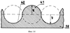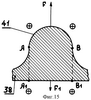 После запуска главного 4 и маршевого 18 двигателей включается муфта сцепления 19 и маршевые движители горизонтального перемещения 23, 24 начинают работать, аэродинамическое судно отходит от причала. При этом вращающийся момент от маршевого двигателя 18 через муфту сцепления 19 карданным валом 20 передается на ведущий вал главного редуктора 21 и далее на ведомые валы и бортовые редукторы 22, 23 затем на воздушные винты изменяемого шага 92. Воздушные винты изменяемого шага, вращаясь, создают воздушный поток внутри корпусов маршевых движителей горизонтального перемещения 24, 25, который перед входом в диффузоры 95 сжимается, а затем с силой выбрасывается наружу, создавая тягу и двигая аэродинамическое судно вперед. После отхода от причала на необходимое расстояние включается муфта сцепления 5 и приходят в движение движители вертикального подъема 12, 13, 14, 15, 16, 17. Крутящийся момент от главного двигателя 4 через муфту сцепления 5, карданный вал передается на управляемый редуктор поперечного управления 7, далее карданным валом через поворотный редуктор 10 на управляемый редуктор продольного управления 6 и затем на неуправляемые передний 8 и задний 9 редукторы, далее на бортовые редукторы 11. Вращаясь, движители вертикального подъема создают подъемную силу, которая уравновешивает вес аэродинамического судна и поднимает его на некоторую высоту над поверхностью воды. Диски 38, 39 движителя вертикального подъема создают подъемную силу следующим образом. При движении воздушного потока вдоль концентрического полукруглого гребня 41 последний обтекает его верхнюю и нижнюю поверхности (фиг.15). Так, как дуга АВ больше отрезка A1B1, то верхняя поверхность будет равна длине дуги АВ, умноженной на длину l концентрического полукруглого гребня S=АВ×l. Нижняя поверхность будет равна отрезку A1B1, умноженному на длину концентрического полукруглого гребня S1=A1B1×l. Нетрудно заметить, что площадь верхней поверхности концентрического полукруглого гребня больше, чем площадь нижней поверхности. Несмотря на то, что обтекание верхней и нижней поверхностей происходит с одной и той же скоростью сила разрежения F в верхней части концентрического полукруглого гребня будет больше силы разрежения F1 в нижней части. где – уд. вес воздуха, v2 – скорость воздушного потока (Н.И.Белавин, Экранопланы, изд.2, Л., Судостроение, 1977, с.23). Разница этих сил и будет подъемной силой концентрического полукруглого гребня. Использование сферической поверхности для создания подъемной силы известно из практики.