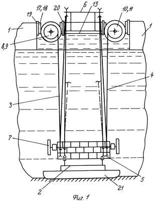 Устройство для подъема затонувшего объекта действует следующим образом. После размещения базового судна 1 над затонувшим объектом 21 с помощью барабанов 8-11 подвижная обойма 5 опускается к затонувшему объекту 21, а грузозахватное приспособление 2 соединяется с затонувшим объектом 21. Одновременно с включением приводов 16 барабанов 8-11 включаются приспособления 7 для стабилизации подвижной обоймы 5. Благодаря этому опускающаяся вниз подвижная обойма 5 стабилизируется в плоскости своего первоначального положения, поэтому не происходит закручивания канатов под действием подводных течений. После захвата затонувшего объекта 21 и реверса приводов 16 барабанов 8-11 при намотке на них канатов 3 и 4 подвижная обойма 5 с грузозахватным приспособлением 2 и затонувшим объектом 21 поднимается вверх. При этом при вращении барабанов 8-11 они смещаются относительно корпуса судна 1 при взаимодействии ползунов 17 и 18 каждого барабана 8-11 с направляющими 19 и 20. Сами же барабаны 8-11 выполняют функцию понтонов. Реакции крутящих моментов, возникающие при вращении барабанов 8-11, через ползуны 17 и 18 воспринимаются направляющими 19 и 20, относительно которых смещаются ползуны 17 и 18 вместе с барабанами 8-11. При спуске подвижной обоймы 5 к затонувшему объекту 21 барабаны 8 и 9 передвигаются в направлениях 22 и 23, а барабаны 10 и 11 – в направлениях 24 и 25. При подъеме затонувшего объекта 21 барабаны 8-11 передвигаются в противоположных направлениях. Причем положения набегающих на барабаны ветвей канатов 3 и 4 в плане как при спуске подвижной обоймы 5, так и при ее подъеме вместе с затонувшим объектом 21 не меняются (фиг.2), независимо от длины барабанов 8-11. Автоматические перемещения барабанов 8-11 происходят за счет межвиткового давления навиваемых на барабаны канатов 3 и 4. Размещение барабанов 8-11 непосредственно на водной поверхности 13 обеспечивает упрощение конструкции устройства, снижение сопротивлений поступательного движения барабанов 8-11 при их вращении, снижение возможных динамических нагрузок на оборудование системы при подъеме затонувшего объекта 21, например при волнении на поверхности водоема.