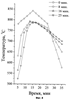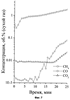 После 5 циклов проводят контрольные измерения распределения температур в слое и глубины очистки получаемого на стадии А) водородсодержащего газа. Полученные данные показывают, что после стадии регенерации Б), осуществляемой в соответствии с настоящим изобретением, слой поглотителя и катализатора содержит область с температурой выше 750°С на входе реагентов в реактор и область с температурой ниже 600°С на выходе продуктов из реактора. Таким образом, подвод тепла непосредственно в слой за счет экзотермической реакции окисления водорода является действенным инструментом для создания требуемого распределения температур. Благодаря наличию на стадии А) высоко- и низкотемпературной областей, содержание СО не превышает 0.002 об.% в течение 12 мин, и 0.01 об.% в течение 16 мин с момента начала стадии (Фиг.7). Концентрация CO2 также остается на уровне ниже 0.01 об.% в течение первых 18 мин. При этом содержание метана составляет менее 2 об.%, а водорода – более 98 об.% на протяжении всей стадии А) в пересчете на сухой газ. На Фиг.8 представлено распределение температур в слое поглотителя и катализатора в различные моменты времени после начала стадии А) паровой конверсии. По мере осуществления стадии А) температуры в разных зонах слоя уравниваются, что негативно сказывается на чистоте получаемого водорода. Так понижение температуры в высокотемпературной зоне слоя на завершающем этапе стадии А) приводит к возрастанию концентрации метана, а повышение температуры в низкотемпературной зоне приводит к увеличению концентрации СО и CO2 На Фиг 7 представлено содержание примесей в получаемом водороде, зарегистрированное на стадии А) в ходе выполнения примера. По данным хроматографического анализа, какие либо иные примеси, отличные от СО, CO2, CH4 и Н2O, отсутствуют в детектируемых количествах.