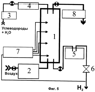 Для преодоления этой проблемы авторами изобретения предложен способ регенерации поглотителя, основанный на выделении тепла при протекании экзотермической химической реакции непосредственно в слое поглотителя. Для этого в качестве регенерирующего агента используют воздух, катодный газ топливного элемента или иной кислородсодержащий газ с содержанием кислорода не менее 5 об.%. Предпочтительное направление движения регенерирующего агента – противотоком к направлению движения реагентов на стадии А). По мере продвижения регенерирующего агента в слое, к нему подмешивают водород, анодный газ топливного элемента или иной водородсодержащий газ с содержанием водорода не менее 40 об.%, способный вступать с кислородом в окислительно-восстановительные превращения с выделением тепла. Для этих целей в реакторе, содержащем неподвижный слой поглотителя и катализатора, предусматривают устройства ввода водородсодержащего газа, располагая их в различных областях слоя, например, как показано на Фиг.5, где приведена схема установки, использованной в примере для паровой конверсии углеводородов в соответствии с настоящим изобретением.