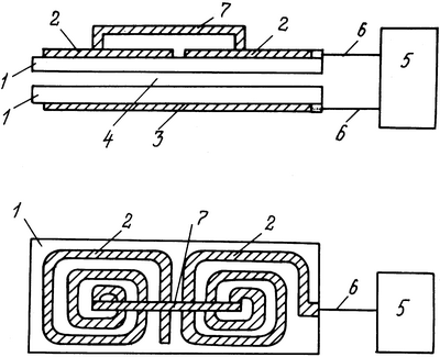 Озонатор содержит диэлектрические пластины 1 (стекло или фторопласт), отделяющие верхний 2 и нижний 3 электроды от щелевого разрядного промежутка 4, электроды присоединены к источнику высокого переменного напряжения 5 токоподводящими проводниками 6, при этом верхний электрод 2 выполнен в виде n плоских спиралей (на фиг.1 показан пример с n=2) и на него подается высокое напряжение от источника 5, а нижний электрод 3 выполнен в виде плоской пластины, которая заземляется вместе с соответствующим электродом источника 5. Спирали электрода 2 соединяются между собой последовательно проводниками 7 (число проводников составляет n-1). Толщина электрода составляет 0,1-0,3 мм. Число витков спирали и геометрические размеры определяются расчетом или экспериментально таким образом, чтобы общее индуктивное сопротивление спирали при заданной частоте тока было по величине близким емкостному сопротивлению озонатора.