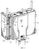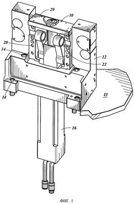 На фиг.1 показаны вставной узел 10 и корпус 12 исполнительного механизма. Корпус исполнительного механизма с помощью соответствующих болтов 14 установлен на верхней стенке 13 рамы секции. Верхняя стенка имеет отверстие (не показано), через которое может проходить двигатель 16 вставного узла 10. Как можно видеть на фиг.2, корпус исполнительного механизма имеет два вертикально расположенных борта 18 (показан один борт), к которым соответствующими болтами 20 крепится корпус 19 вставного узла. Установочные штифты 22 обеспечивают правильное расположение. К корпусу 19 вставного узла прикреплены двигатель 16 и шариковый винт 24, который проходит между верхней пластиной 29 и соединительной муфтой 23 двигателя (фиг.5). С шариковым винтом соединена гайка 25, к которой прикреплены оси 26 для шарнирной поддержки с одного конца двух приводных рычагов 27. Вал 30 (фиг.3) имеет две цилиндрические опорные поверхности 33 (фиг.6) для помещения в отверстия 31 рычагов и две плоские части 28 с каждой стороны опорных поверхностей 33. В этих плоских частях выполнены резьбовые отверстия 32.