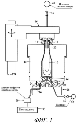 На фиг.1 изображен схематический вид механизма выдувной головки устройства для изготовления стеклянных емкостей индивидуального профиля. Черновая заготовка 10, которая имеет сформированный венчик (резьбовую часть) 12 в верхней части, подвешена за венчик 12 механизмом переворота (не показан). Пара противостоящих половин 14 формы для выдувания выполнена с возможностью перемещения из разделенного открытого положения в показанное закрытое положение, в котором они поддерживают черновую заготовку сразу под венчиком и входят в контакт с поддоном 15 для закрывания дна формы. Механизм 16 выдувной головки, который удерживает выдувную головку 18, перемещается вниз и с поворотом располагает выдувную головку так, что она находится вокруг венчика, при этом выдувная трубка 20 выдувной головки находится внутри черновой заготовки. Когда удерживаемая черновая заготовка подогрета, она будет растягиваться вниз под собственным весом. Когда черновая заготовка достигает дна формы, она будет входить в контакт с поддоном 15, и передача тепла поддону будет повышать температуру термопары 22, установленной в поддоне. Электропроводка 23 термопары соединяется в соединении 24 с электропроводкой 26, ведущей от основания 28 поддона к аналого-цифровому преобразователю 29, который преобразует аналоговое значение напряжения в цифровой сигнал, который обрабатывается контроллером 30. Когда черновая заготовка касается термопары, будет генерирован всплеск напряжения, который может выявляться контроллером как сигнал о прикосновении черновой заготовки к термопаре.
