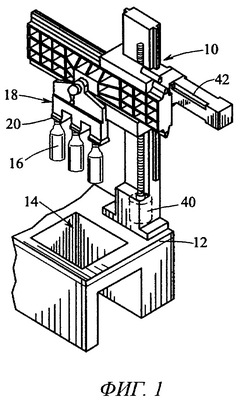 На фиг.1 изображен извлекающий механизм 10, установленный на секционной раме 12 устройства для изготовления стеклянных емкостей индивидуального профиля вблизи пункта 14 выдувания, где из черновой заготовки (не показана), расположенной в паре закрытых форм для выдувания (также не показаны), выдувают бутылку 16. В патенте США №5895513 описан известный извлекающий механизм. Извлекающий механизм включает захватный кронштейн 18, который удерживает захватную головку 20 для каждой бутылки, изготовленной в пункте выдувания. На чертежах три бутылки удерживаются в трех захватных головках, и устройство для изготовления стеклянных емкостей индивидуального профиля, соответственно, работает с тремя каплями стекломассы.