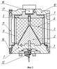 Второй этап – гидростатическое прессование (см. фиг.2). На заготовку ВВ 6 с поддоном 1, конусом 2, облицовкой 3 надевают два кольца 7 переменного сечения и прижимают одно кольцо к поддону 1, а второе к крышке 5 (после ее установки). Устанавливают крышку 5. На крышку 5, заготовку ВВ 6 и поддон 1 надевают резиновую оболочку 9, при этом выступающие элементы на фланцах оболочки должны войти в соответствующие пазы крышки 5 и поддона 1. Стакан 11 устанавливают на поддон 1 и жестко скрепляют его с поддоном болтами 16, заневоливая нижний торец оболочки 9 между поддоном и стаканом. Сверху на стакан 11 устанавливают диск 10 и скрепляют его болтом 18 с крышкой 5, заневоливая таким образом верхний торец оболочки 9. Диск 10, скрепленный с крышкой жестко, скрепляют со стаканом 11 болтами 17. Через самозапирающийся клапан 12 удаляют воздух и помещают пресс-инструмент в камеру высокого давления (гидростат), которую герметизируют, создают предварительное давление, составляющее 40-70% от заданного давления прессования, нагревают до температуры переработки конкретного ВВ (для ОМА 125±5°), увеличивают давление прессования до заданного и выдерживают в течение 15-30 минут. В процессе выдержки эластичная оболочка передает давление, создаваемое в камере высокого давления, заготовке ВВ и уплотняет ее равномерно по всей боковой поверхности до заданной плотности. По окончании выдержки гидростат охлаждают до температуры 60°С, снимают давление в камере гидростата, разгерметизируют его, извлекают пресс-инструмент, разбирают его и снимают готовый заряд, соединенный с облицовкой.