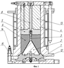 Примером конкретного выполнения устройства для изготовления зарядов ВВ может служить пресс-инструмент, включающий поддон, выполненный из стали 45 и покрытый хромом, с установленными в специальные гнезда и жестко скрепленными с поддоном конусом и самозапирающимся клапаном. На торцевой поверхности поддона имеется кольцевая проточка шириной 4 мм, глубиной 5 мм и посадочное место под стакан 220 мм. На внутреннем торце крышки выполнена профильная поверхность, предназначенная для формирования детали, а на внешнем торце выполнен конический выступ с резьбовым отверстием, предназначенный для крепления крышки с диском, и две кольцевые проточки шириной 4 мм, глубиной 5 мм. Крышка скреплена с диском, выполненным из стали 45 и покрытым хромом, в котором имеется посадочное место под стакан 210 мм. Резиновая оболочка, изготовленная из резины ИРП 1354 ТУ 38 005.1166-98, выполнена в виде цилиндра 186 мм. В нижней части цилиндр переходит в кольцевой фланец, который в свою очередь переходит в цилиндрическую поверхность 217 мм. На внутренней поверхности фланца имеется кольцевой выступ шириной 3 мм и высотой 5 мм. В верхней части цилиндр переходит во фланец, имеющий внутренний диаметр 92 мм. На внутренней плоскости этого фланца имеются два кольцевых выступа шириной 3 мм и высотой 5 мм. Стакан выполнен из стали 45 в виде обечайки с толщиной стенки 20 мм. На внутреннем диаметре обечайки выполнены посадочные места под поддон и диск, скрепленный с крышкой. В нижней части стакана на расстоянии 47 мм от торца имеется внутренний фланец, предназначенный для поджима оболочки к поддону. На торцевых поверхностях стакана имеется по шесть равномерно расположенных отверстий, предназначенных для крепления к стакану диска с крышкой и поддона, причем со стороны поддона отверстия гладкие, а со стороны диска – резьбовые.