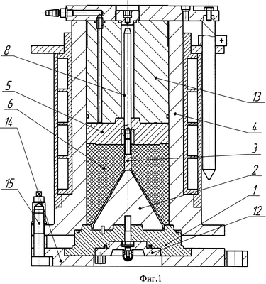 Первый этап – формирование заготовки до плотности 75% от теоретически максимально достижимой (ТМД) осуществляется с использованием элементов пресс-формы для жесткого прессования следующим образом (см. фиг.1). На поддон 1, собранный с конусом 2, самозапирающимся клапаном 12 и установленный в подставку 14, устанавливают медную облицовку 3. Затем на поддон устанавливают направляющую 4, нагретую до температуры 130°С, скрепляют ее с подставкой 14 четырьмя болтами 15 и устанавливают удлинитель 8. В полость, образованную поддоном 1 и направляющей 4, засыпают навеску состава ОМА 6, предварительно нагретого до температуры 130°С. В направляющую устанавливают крышку 5, пуансон 13 и с помощью пресса уплотняют состав до плотности 75% от ТМД, после чего снимают направляющую с пуансоном и вкладышем с поддона.