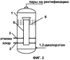 Способ высокотемпературного хлорирования проводится в реакторе (фиг.2), представляющем собой барботажную газлифтную колонну 1, снабженную внутренней циркуляционной трубой 5. Рабочей средой является продукт реакции – жидкий 1,2-дихлорэтан. Через распределитель 2 газообразный хлор подается в нижнюю часть кольцевого пространства, где он растворяется в рабочей среде. Реакция осуществляется выше по потоку при вводе газообразного этилена через распределитель 3. Вследствие выделения большого количества тепла реакции рабочая среда закипает. Благодаря возникающей разности плотностей сред в циркуляционной трубе и в кольцевом пространстве возникает циркуляция жидкости. В верхней части перемешивание реакционной среды увеличивается на перфорированных тарелках 6. Продукты реакции отводятся в виде паров на стадию ректификации через штуцер в крышке реактора. В зависимости от давления в верхней части реактора (1-2 ата) температура кипения рабочей среды составляет 83-110°С. Побочными продуктами процесса являются: трихлорэтан, трихлоэтилен и другие высшие хлорпроизводные этана, которые образуются в результате реакций заместительного хлорирования. Скорость побочных реакций снижается при уменьшении температуры [3].