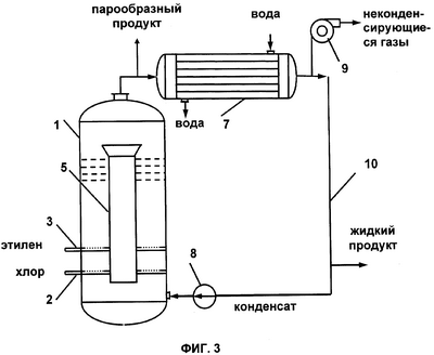 Фиг.3 – колонна 1, газораспределители 2 и 3, циркуляционная труба 5, конденсатор 7, насос 8, вакуум-насос 9, линия возврата части жидкого продукта в нижнюю часть реактора 10.