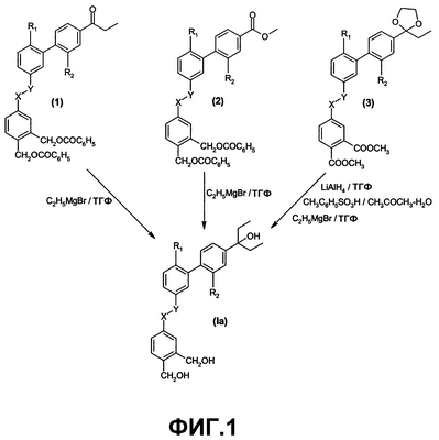 Когда -X-Y- представляет собой связь структуры -CH2-O- или -CH2-N(R4)-, соединения формулы (Ia) получают, предпочтительно, исходя из соединений (1) и (2), полученных согласно схемам реакции фиг.2.