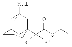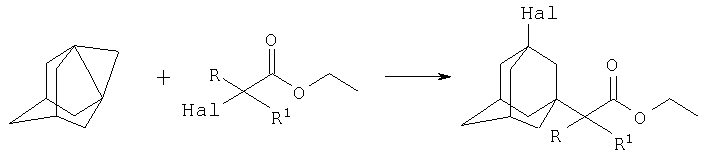 где Hal=Br, R=H: R1=H, СН3, C2H5, С3Н7; Hal=Br, R=СН3: R1=CH3; Hal=Cl, R=Cl: R1=Cl, которые могут представлять интерес в качестве полупродуктов в синтезе некоторых биологически активных веществ. Техническим результатом является расширение ассортимента химических соединений, в частности получение новых 3-галоген-1-(этоксикарбонил)алкиладамантанов с высоким выходом. Способ заключается во взаимодействии 1,3-дегидроадамантана с этиловыми эфирами -галогеналканкарбоновых кислот из ряда: этил 2-бромацетат, этил 2-бромпропионат, этил 2-бромбутират, этил 2-бромвалерат, этил 2-бром-2-метилпропионат, этил 2,2,2-трихлорацетат при мольных соотношениях реагентов, равных соответственно 1:3-5, в среде исходных этиловых эфиров -галогеналканкарбоновых кислот, при температуре 50-60°С в течение 4-6 часов.