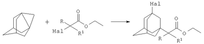 Сущностью метода является реакция получения 3-галоген-1-(этоксикарбонил)алкиладамантанов по реакции присоединения к 1,3-дегидроадамантану (1,3-ДГА) соответствующих этиловых эфиров -галогеналканкарбоновых кислот.