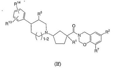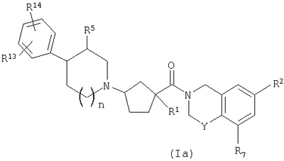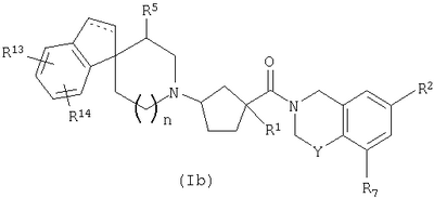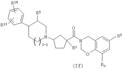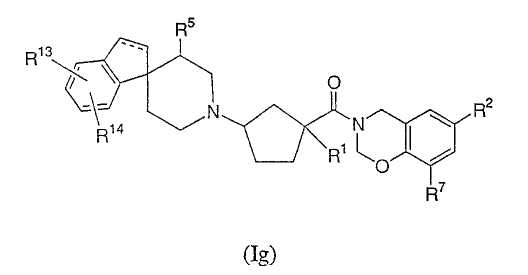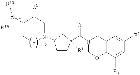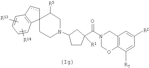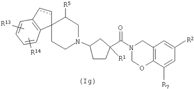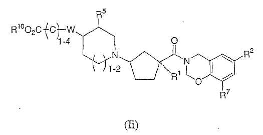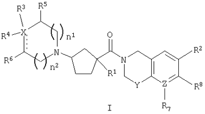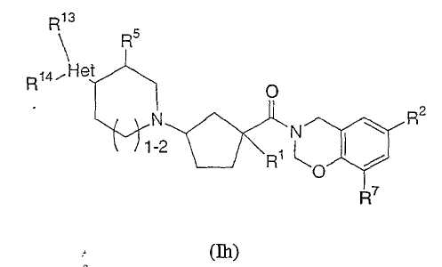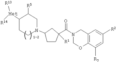 Настоящее изобретение касается циклопентильных соединений, связанных с бензоксазинильной группой через амидофрагмент с использованием кольцевого атома азота бензоксазина и дополнительно замещенных гетероциклическим фрагментом, такие соединения представлены формулой I