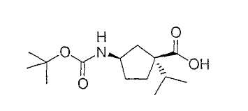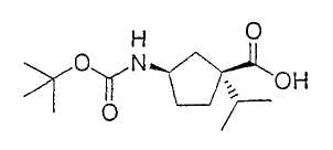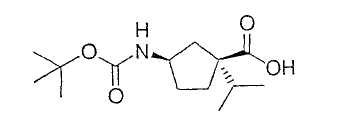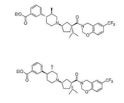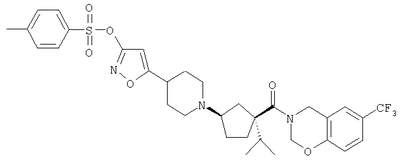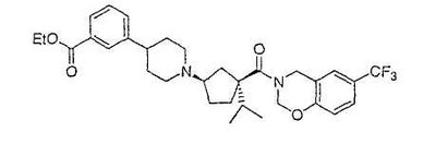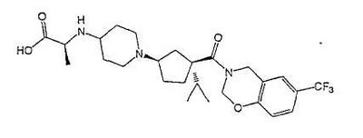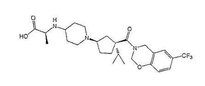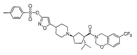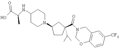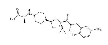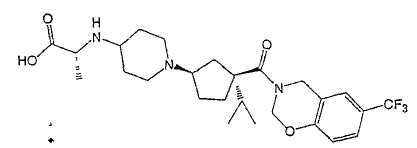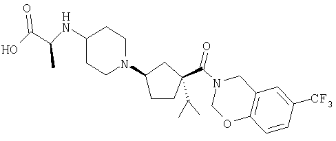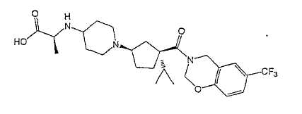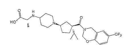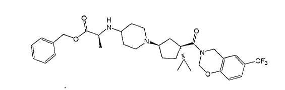Соль D-аланинбензилового эфира пара-толуолсульфоновой кислоты (22 мг, 0,062 ммоль), триэтиламин (9,0 мкл, 0,062 ммоль) и триацетоксиборогидрид натрия (22 мг, 0,10 ммоль) добавляют к перемешиваемому раствору 1-((1R,3S)-3-изопропил-3-{[6-(трифторметил)-2Н-1,3-бензоксазин-3(4Н)-ил]карбонил}циклопентил)пиперидин-4-она (19 мг, 0,021 ммоль) в ДХМ (10 мл). Реакционную смесь перемешивают при к.т. в течение 96 час, однако взаимодействие проходит не до конца. К реакционной смеси добавляют еще 39 мг (0,11 ммоль) соли L-аланинбензилового эфира пара-толуолсульфоновой кислоты и 15 мкл (0,11 ммоль) триэтиламина. После перемешивания в течение дополнительных 72 час при к.т. реакционную смесь разбавляют дихлорметаном (50 мл), промывают раствором бикарбоната натрия (1×50 мл) и насыщенным раствором соли (1×50 мл), сушат над сульфатом магния, фильтруют и концентрируют при пониженном давлении. Очистка методом препаративной ТСХ (силикагель, 0,25% гидроксид аммония, 2,25% MeOH, 97,5% ДХМ) дает требуемый продукт. ЭСИ-МС: рассчитано для C33H42F3N3O4 601,70; найдено 602 (M+H).