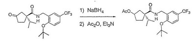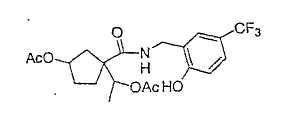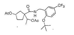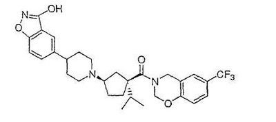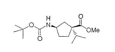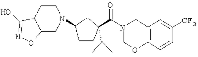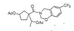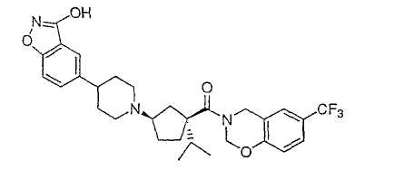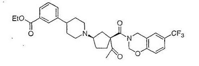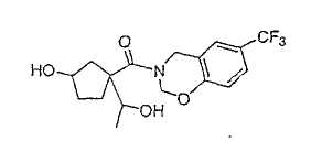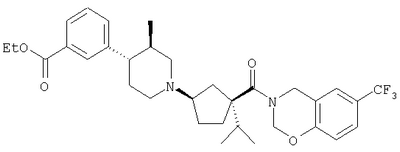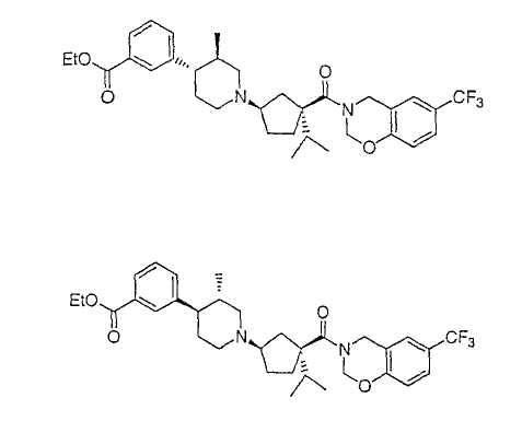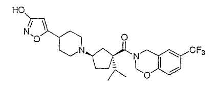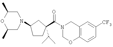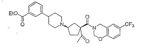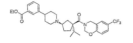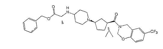 Гидрохлорид L-аланинбензилового эфира (11 мг, 0,062 ммоль), триэтиламин (9,0 мкл, 0,062 ммоль) и триацетоксиборогидрид натрия (22 мг, 0,10 ммоль) добавляют к перемешиваемому раствору 1-((1R,3S)-3-изопропил-3-{[6-(трифторметил)-2Н-1,3-бензоксазин-3(4H)-ил]карбонил}циклопентил)пиперидин-4-она (19 мг, 0,021 ммоль) в ДХМ (10 мл). Реакционную смесь перемешивают при к.т. в течение 96 час, однако взаимодействие проходит не до конца. К реакционной смеси добавляют еще 19 мг (0,11 ммоль) гидрохлорида L-аланинбензилового эфира и 15 мкл (0,11 ммоль) триэтиламина. После перемешивания в течение дополнительных 72 час при к.т. реакционную смесь разбавляют дихлорметаном (50 мл), промывают раствором бикарбоната натрия (1×50 мл) и насыщенным раствором соли (1×50 мл), сушат над сульфатом магния, фильтруют и концентрируют при пониженном давлении. Очистка методом препаративной ТСХ (силикагель, 0,25% аммония гидроксид, 2,25% MeOH, 97,5% ДХМ) дает требуемый продукт. ЭСИ-МС: рассчитано для C33H42F3N3O4 601,70; найдено 602 (M+H).