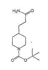 Коммерчески доступную BOC-пиперидинилпропионовую кислоту (2,79 г, 10,8 ммоль) растворяют в 100 мл ДХМ и охлаждают до 0°C. Триэтиламин (1,66 мл, 11,9 ммоль) и изобутилхлорформиат (1,55 мл, 11,9 ммоль) добавляют к охлажденному раствору, реакционную смесь нагревают до к.т. и перемешивают в течение 15 мин. ТСХ показывает полное расходование BOC-пиперидинилпропионовой кислоты. Затем реакционную смесь барботируют газообразным аммиаком в течение 5 мин. Реакционную смесь промывают раствором бикарбоната натрия (1×75 мл), 1 н. HCl (1×75 мл) и насыщенным раствором соли (1×75 мл), сушат над сульфатом магния, фильтруют и концентрируют. Очистка методом СДЖХ (силикагель, 0-100% EtOAc/гексан) дает требуемый продукт. ЭСИ-МС: рассчитано для C13H24N2O3 256,34; найдено 157 (M-BOC+H).