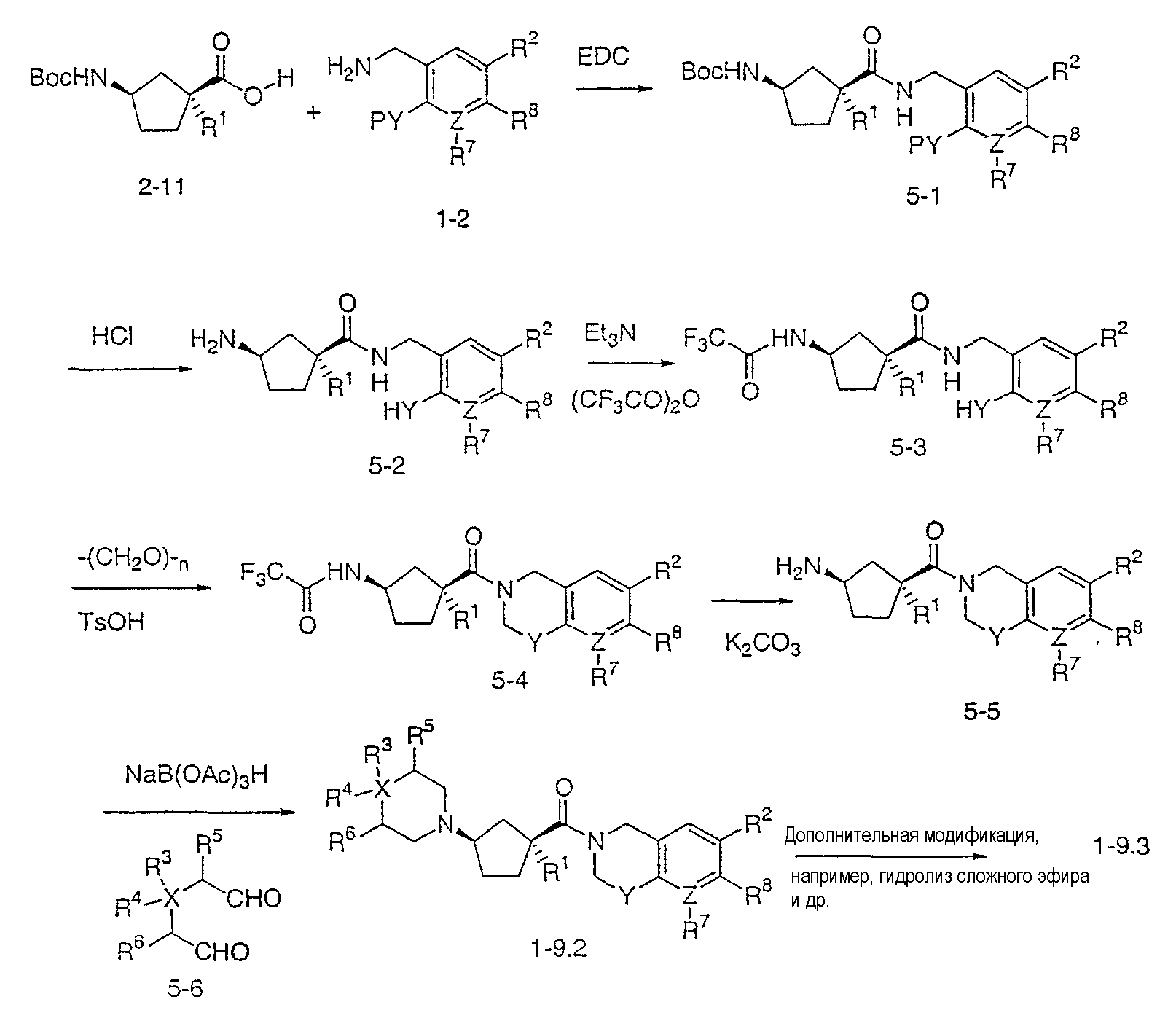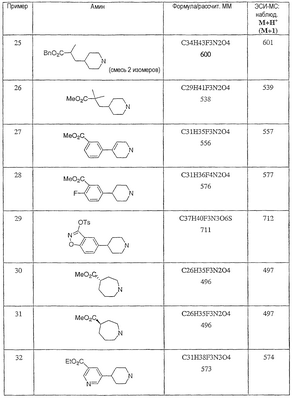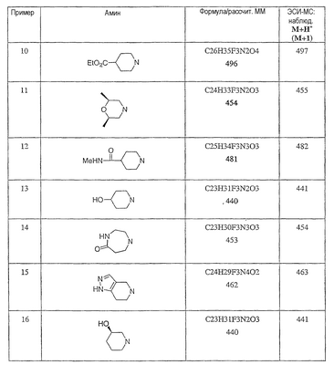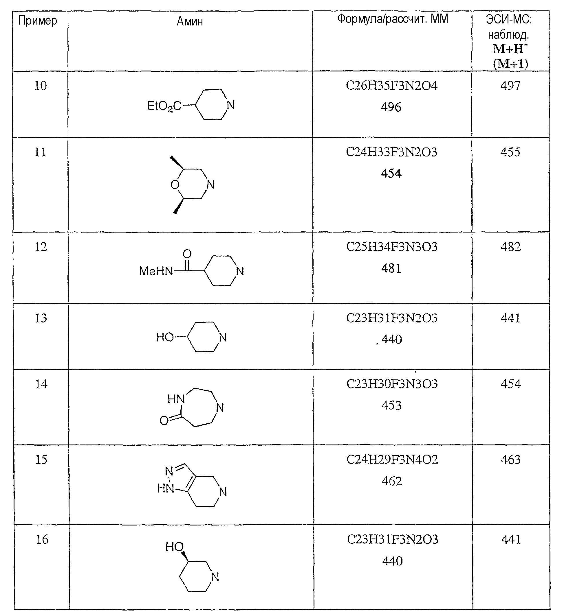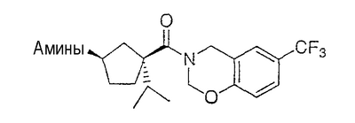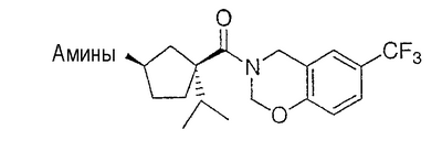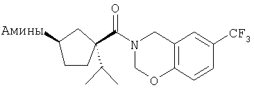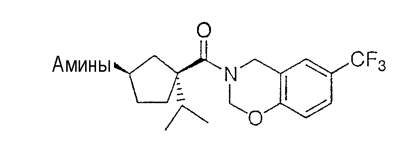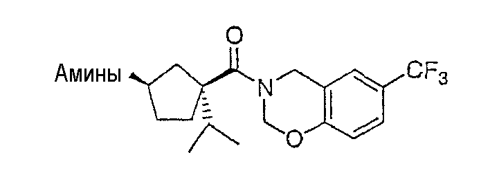 Ряд CCR-2 модуляторов получают способом, аналогичным описанному для примера 1, из (3S)-3-изопропил-3-{[6-(трифторметил)-2Н-1,3-бензоксазин-3(4Н)-ил]карбонил}циклопентанона (промежуточный продукт 4) и аминов, доступных из коммерческих источников, известных из научной литературы или описанных в рамках данного документа. цис- и транс-Изомеры, которые получают в результате восстановительного аминирования, разделяют либо методом хиральной ВЭЖХ (с применением колонки ChiralCel OD, 2 см×25 см, или ChiralPak AD, 2 см×25 см, обе доступны от Chiral Technologies, Inc.), либо препаративной ТСХ. В некоторых случаях, где амины, использованные в реакциях восстановительного аминирования, сами представляют смеси более чем одного стереоизомера (т.е. если они имеют один или более стереоцентров), обычно можно разделить все возможные изомеры с применением хиральной ВЭЖХ и/или препаративной ТСХ (иногда требуются серии разделений). В таблице 1 перечислены некоторые типичные примеры этих аналогов (показаны только более биологически активные цис-изомеры).
