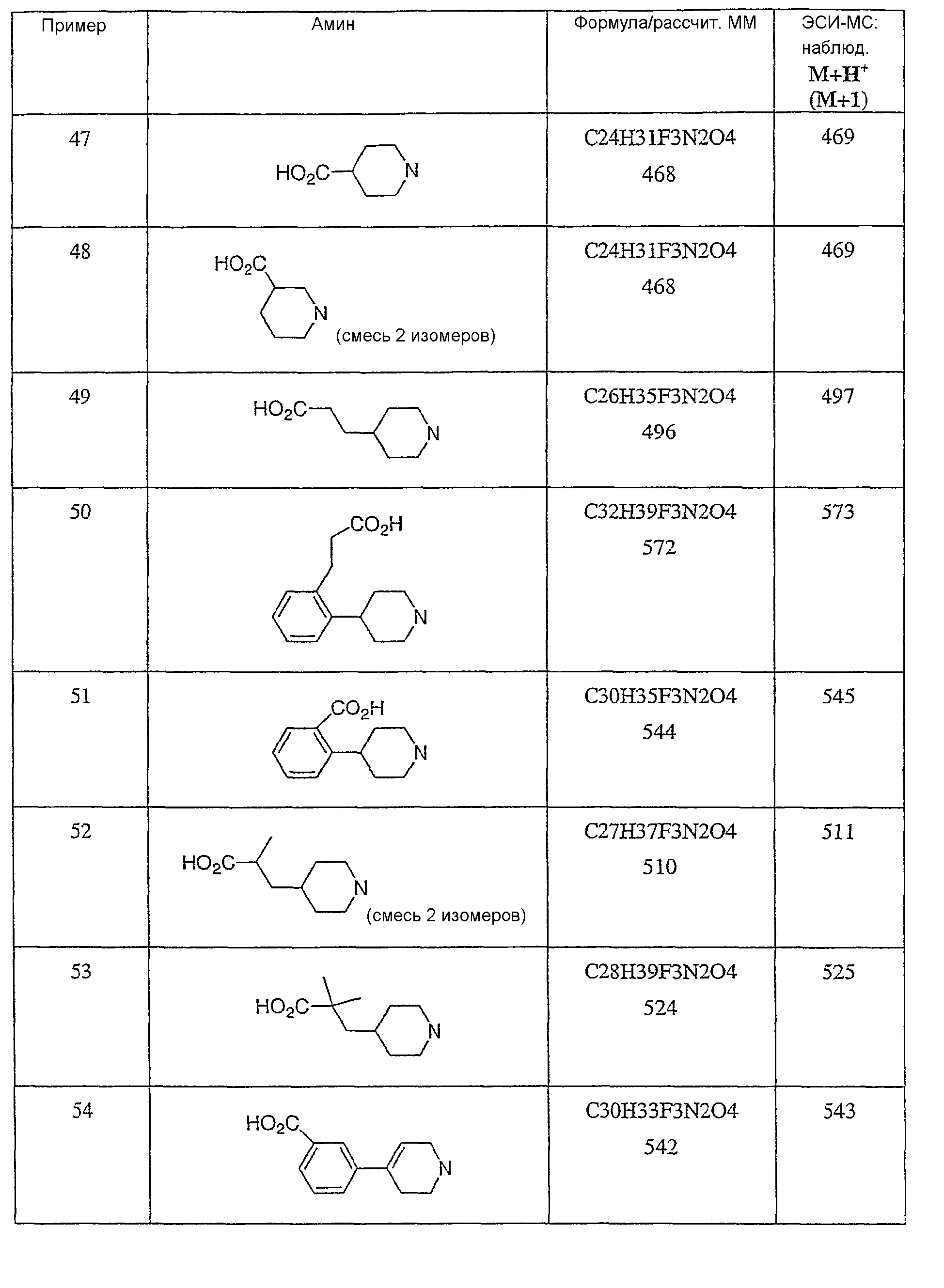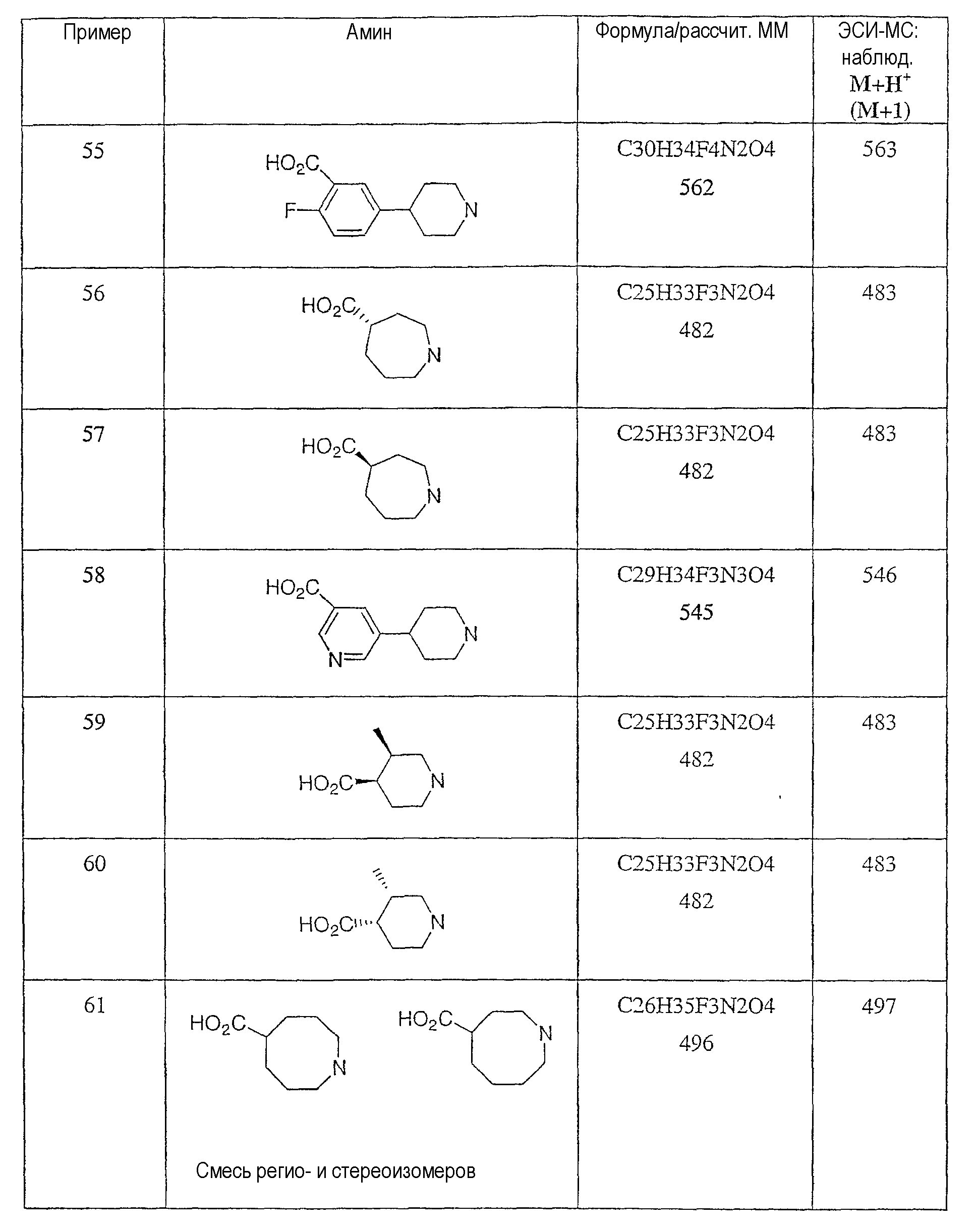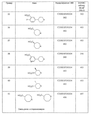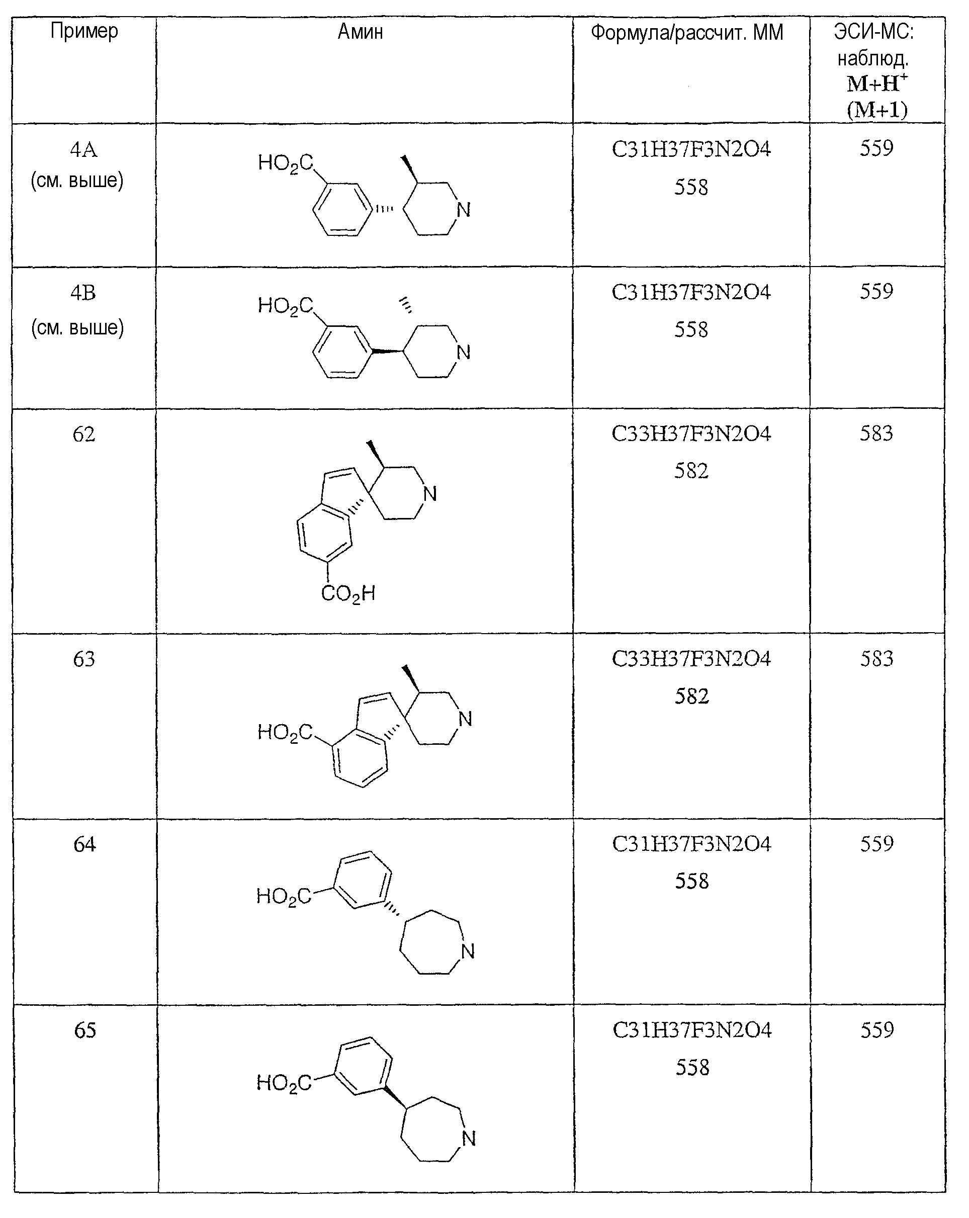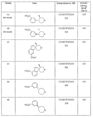 Во многих случаях аналоги, перечисленные в таблице 1, можно далее модифицировать, получая новые целевые модуляторы хемокиновых рецепторов. Например, сложноэфирные группы аналогов, указанных в данной таблице, гидролизуют, получая соответствующие карбоновые кислоты, которые сами являются сильнодействующими модуляторами. Данный гидролиз обычно выполняют в условиях, показанных в примере 2 и примере 4, или с небольшими модификациями этих условий. По-другому, в случае бензиловых сложных эфиров карбоновую кислоту можно получить гидрированием по протоколу, описанному для стадии F промежуточного продукта 3, или с его небольшими модификациями. Список типичных получаемых карбоновых кислот, содержащих модуляторы хемокиновых рецепторов, представлен в таблице 2.