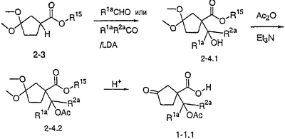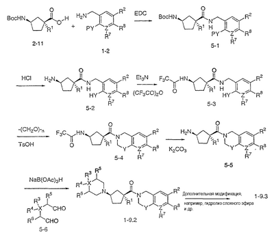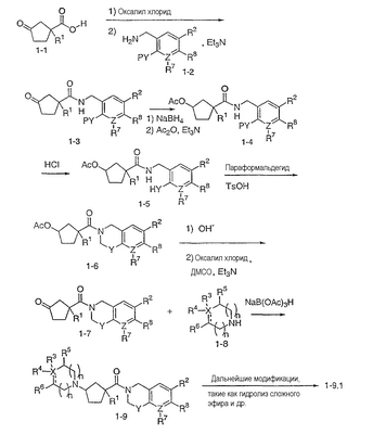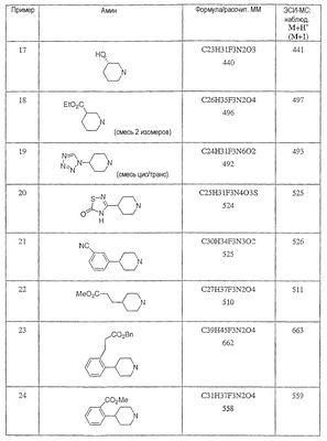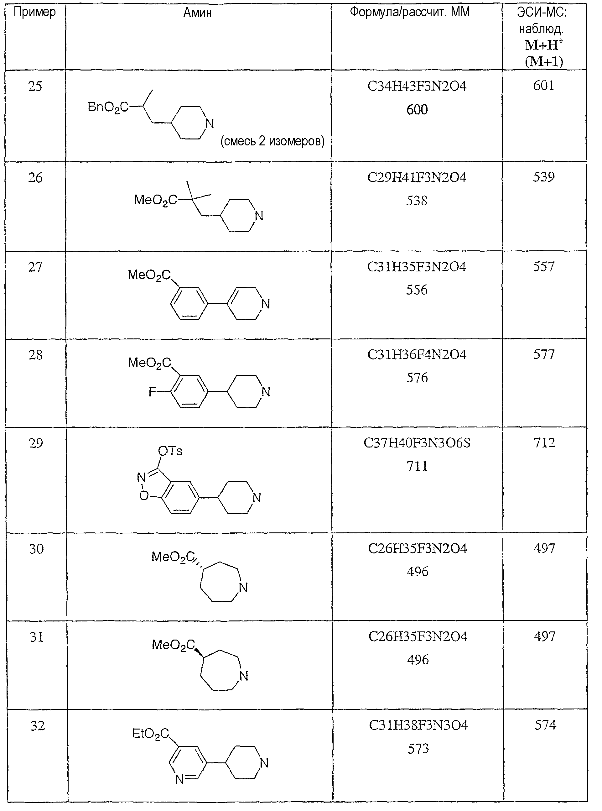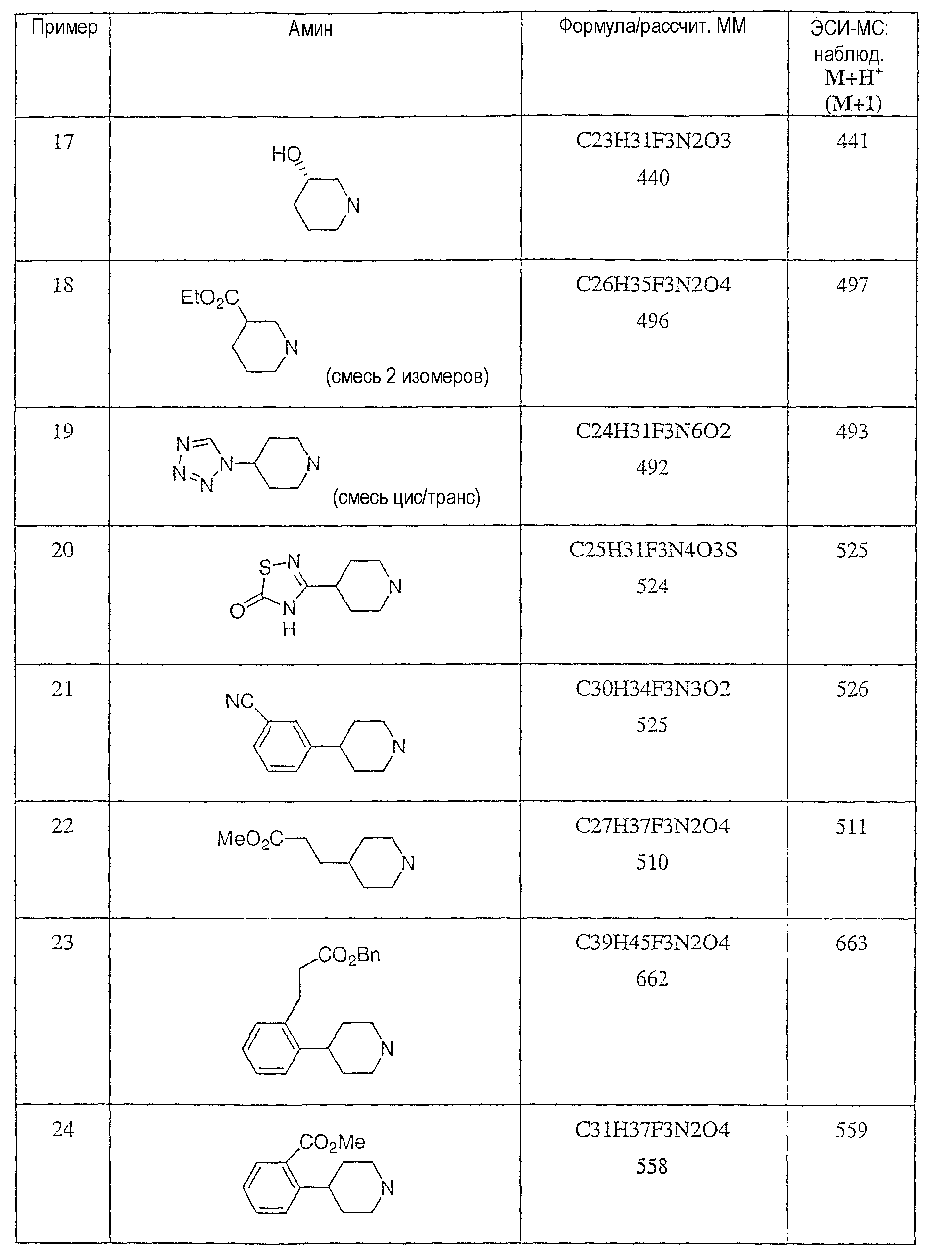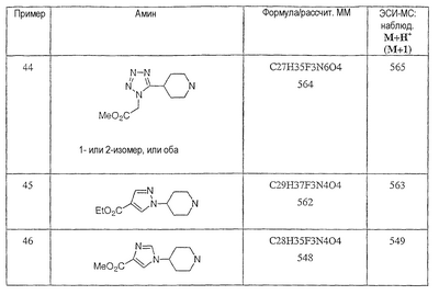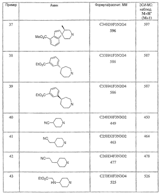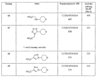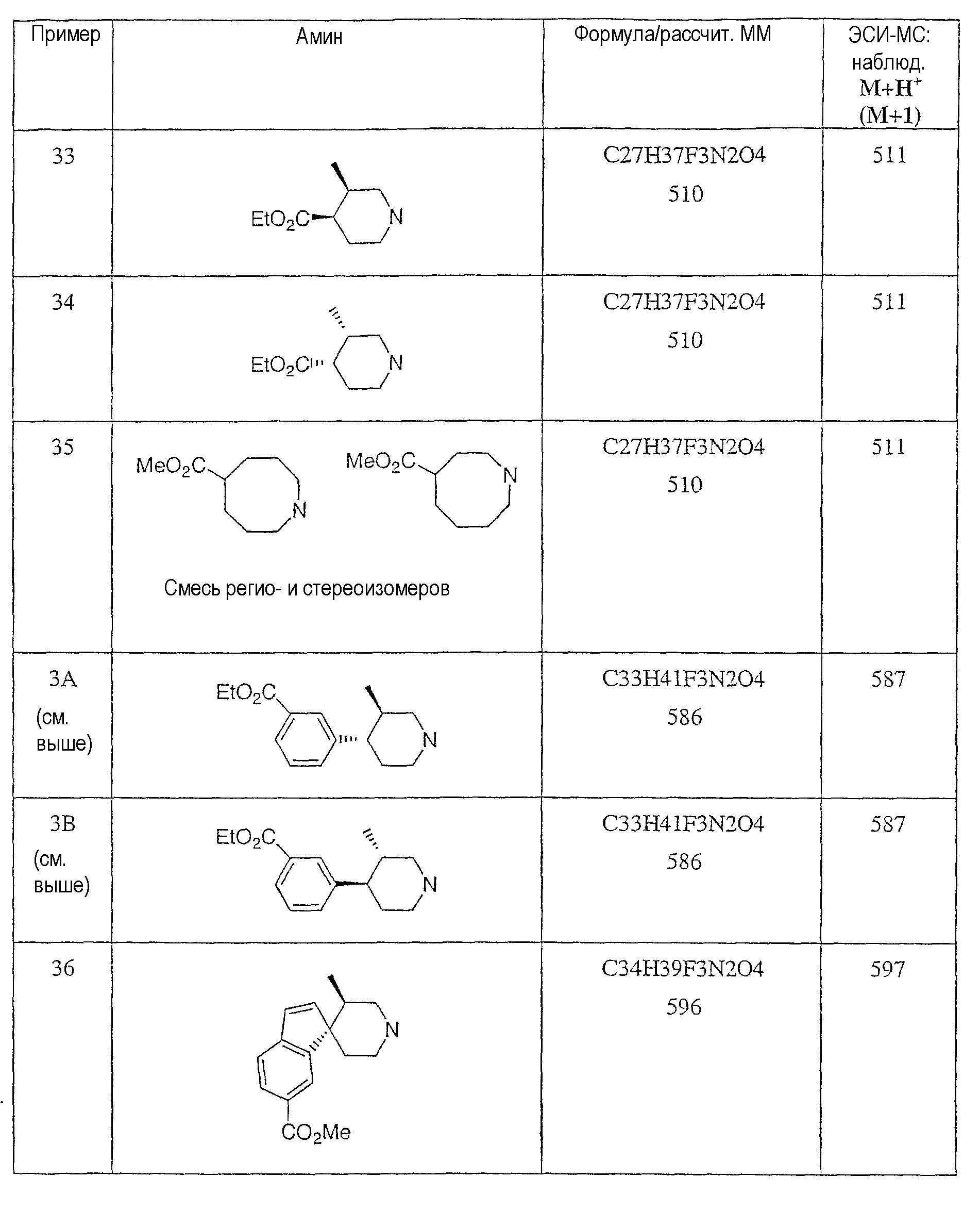 Во многих случаях аналоги, перечисленные в таблице 1, можно далее модифицировать, получая новые целевые модуляторы хемокиновых рецепторов. Например, сложноэфирные группы аналогов, указанных в данной таблице, гидролизуют, получая соответствующие карбоновые кислоты, которые сами являются сильнодействующими модуляторами. Данный гидролиз обычно выполняют в условиях, показанных в примере 2 и примере 4, или с небольшими модификациями этих условий. По-другому, в случае бензиловых сложных эфиров карбоновую кислоту можно получить гидрированием по протоколу, описанному для стадии F промежуточного продукта 3, или с его небольшими модификациями. Список типичных получаемых карбоновых кислот, содержащих модуляторы хемокиновых рецепторов, представлен в таблице 2.