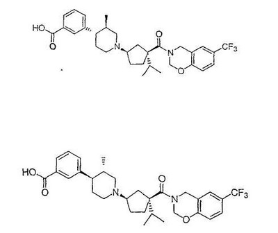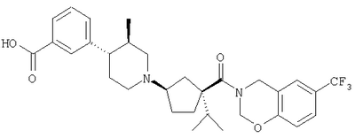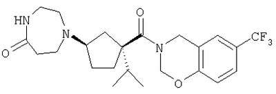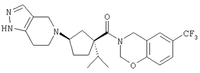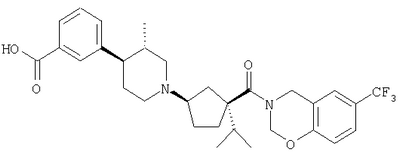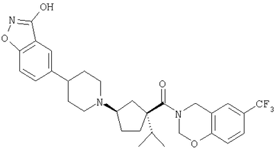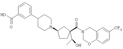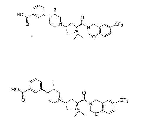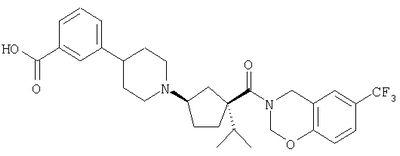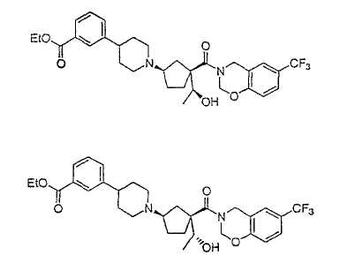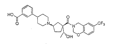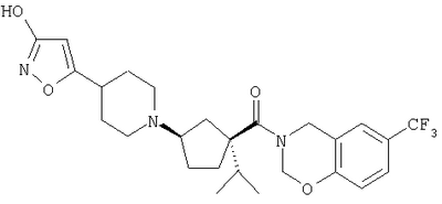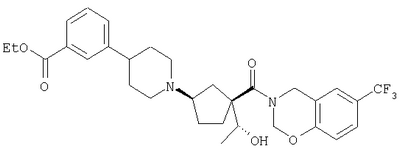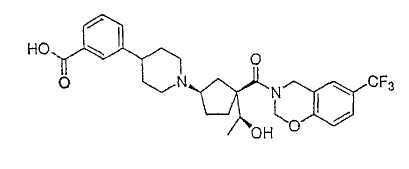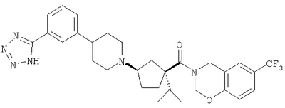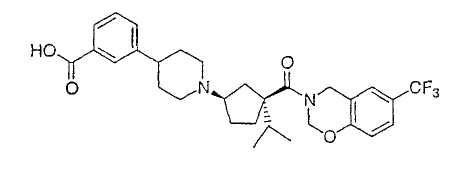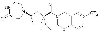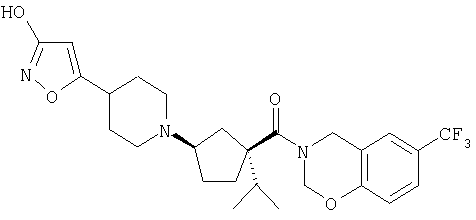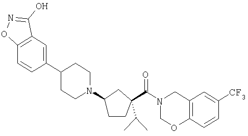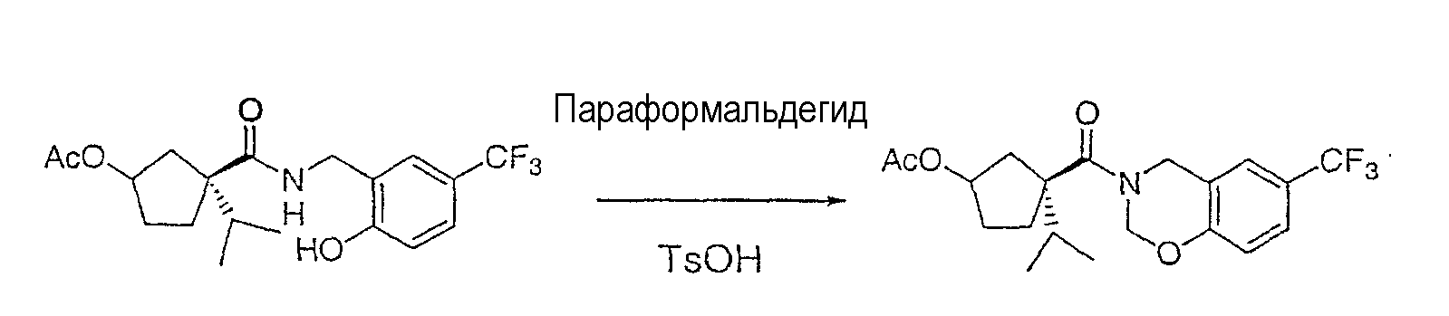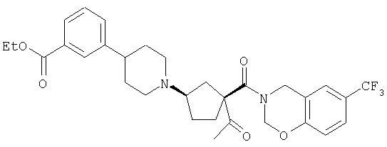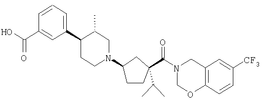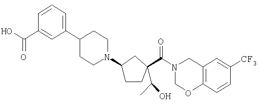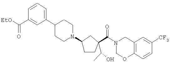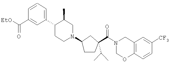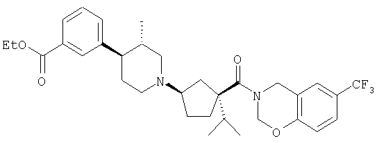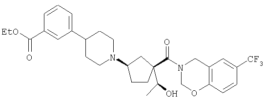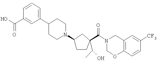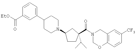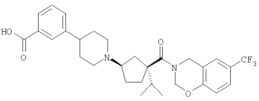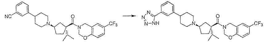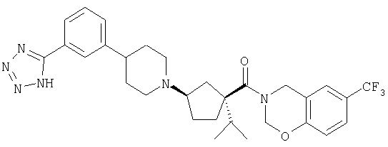 Раствор 3-[1-((1R,3S)-3-изопропил-3-{[6-(трифторметил)-2H-1,3-бензоксазин-3(4H)-ил]карбонил}циклопентил)пиперидин-4-ил]бензонитрила (полученного, как описано ранее, 31,7 мг, 0,0603 ммоль) и трибутилоловоазида (50 мкм, 0,18 ммоль) в 10 мл толуола перемешивают в атмосфере азота при кипении с обратным холодильником в течение ночи. Так как взаимодействие не протекает в большой степени, добавляют еще трибутилоловоазид (200 мкл, 0,603 ммоль) и перемешивают реакционную смесь в атмосфере азота при кипении с обратным холодильником в течение 4,5 час. В этот момент добавляют еще трибутилоловоазид (200 мкл, 0,603 ммоль) и перемешивают реакционную смесь в атмосфере азота при кипении с обратным холодильником в течение ночи. Реакционную смесь концентрируют, затем добавляют безводный 1 н. HCl в эфире и смесь перемешивают в течение 15 мин, затем концентрируют. Твердые вещества в колбе отделяют от масла (предположительно Bu3SnCl), отбирая масло пипеткой. К оставшимся твердым веществам добавляют насыщенный раствор соли и ДХМ. Доводят рН водного слоя до 7 и слои разделяют. Водный слой промывают еще дважды ДХМ и затем органические слои объединяют, сушат над безводным MgSO4, фильтруют и концентрируют. После очистки методом препаративной ТСХ (диоксид кремния, 50% этилацетат/гексан для перемещения оставшегося Bu3SnCl, основу собирают) проводят ВЭЖХ с обращенной фазой (YMC Pack Pro C18, 100×20 мМ, вн. диам.) с получением продукта в виде его TFA-соли. Данный продукт превращают в его HCl-соль, растворяя в ДХМ и добавляя избыток 1 н. HCl/эфир, затем концентрируя с получением 3-[((1S,3R)-1-изопропил-3-{4-[3-(1Н-тетраазол-5-ил)фенил]пиперидин-1-ил}циклопентил)карбонил]-6-(трифторметил)-3,4-дигидро-2Н-1,3-бензоксазингидрохлорида. ЭСИ-МС: рассчитано для C30H35F3N6O2 568; найдено 569 (M+H).
