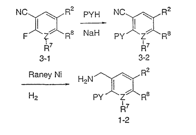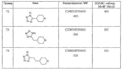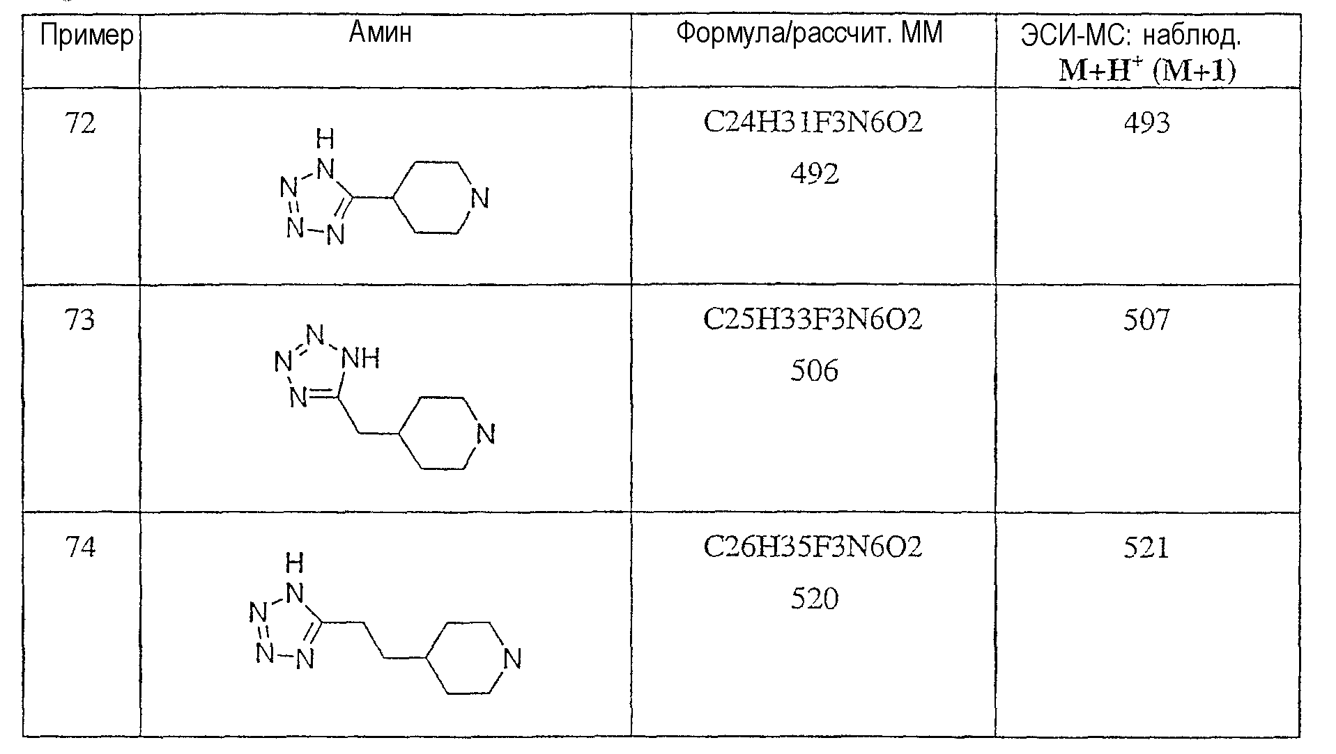 Другой способ модификации некоторых аналогов, представленных в таблице 1, с получением новых, сильнодействующих модуляторов хемокиновых рецепторов включает преобразование нитрильных групп, обнаруживаемых в некоторых аналогах в таблице 1, в тетразольные группы. Способ осуществления этого описан ниже в примере 71.