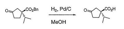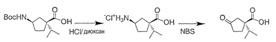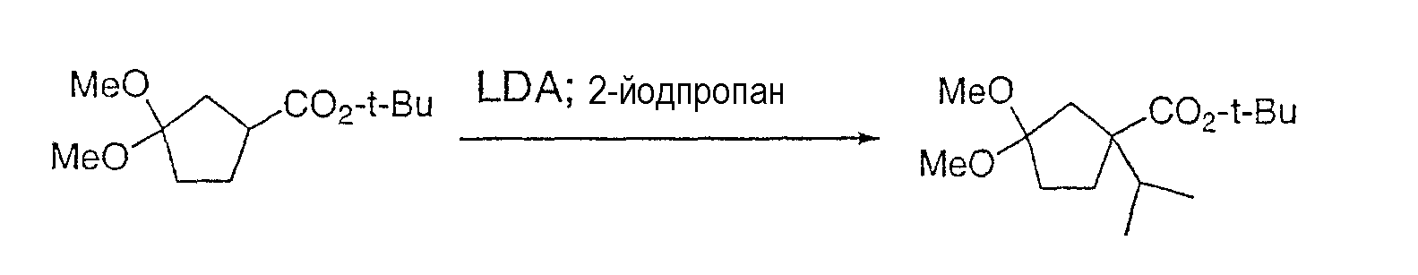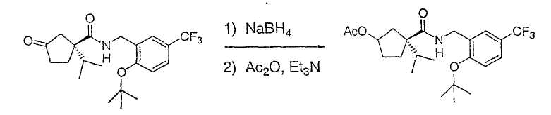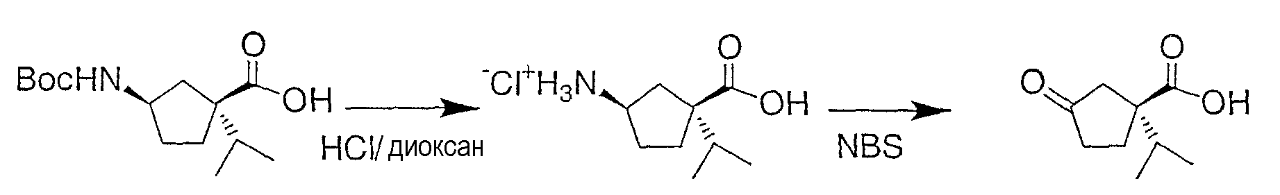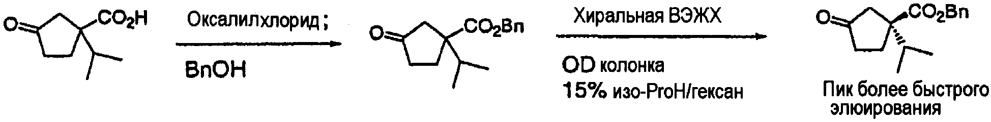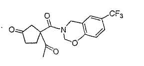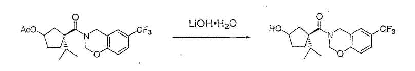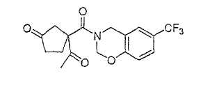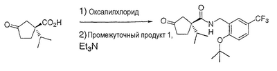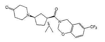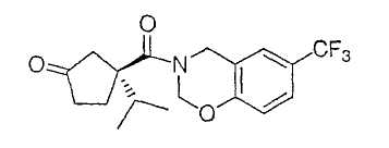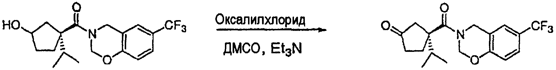 Раствор оксалилхлорида (35,0 мкл, 0,402 ммоль) в 15 мл ДХМ охлаждают до -78°C. К перемешиваемому раствору добавляют по капле ДМСО (57,0 мкл, 0,805 ммоль). Через 5 мин к реакционной смеси добавляют по капле 1-((1R,3S)-3-изопропил-3-{[6-(трифторметил)-2Н-1,3-бензоксазин-3(4H)-ил]карбонил}циклопентил)пиперидин-4-ол (пример 13, таблица 1, 88 мг) в 5 мл ДХМ за 3 мин. После перемешивания еще в течение 25 мин при -78°C добавляют по капле триэтиламин (224,0 мкл, 1,609 ммоль) в 5 мл ДХМ за 1 мин. Реакционную смесь перемешивают при -78°C в течение 10 мин до удаления бани сухой лед/ацетон. Реакционной смеси дают нагреться до к.т. и перемешивают в течение 1,5 час. Затем реакционную смесь разбавляют ДХМ (50 мл) и промывают 1 н. раствором HCl (1×75 мл), раствором бикарбоната натрия (1×75 мл) и насыщенным раствором соли (1×75 мл). Водные слои объединяют и экстрагируют дихлорметаном (5×100 мл). Органические слои объединяют, сушат над сульфатом магния, фильтруют и концентрируют при пониженном давлении. Очистка методом препаративной ТСХ (силикагель, 0,4% гидроксид аммония, 3,6% MeOH, 96% ДХМ) дает 1-((1R,3S)-3-изопропил-3-{[6-(трифторметил)-2Н-1,3-бензоксазин-3(4Н)-ил]карбонил}циклопентил)пиперидин-4-он. ЭСИ-МС: рассчитано для C23H29F3N2O3 438,48; найдено 457 (гидрат+H).