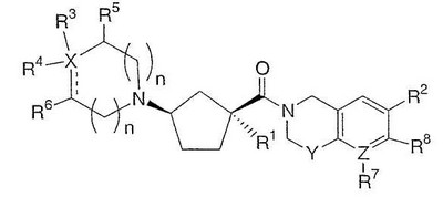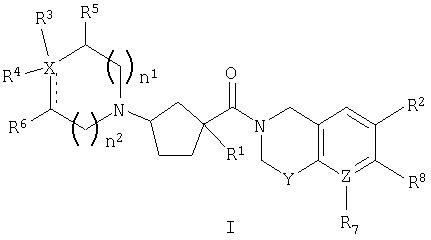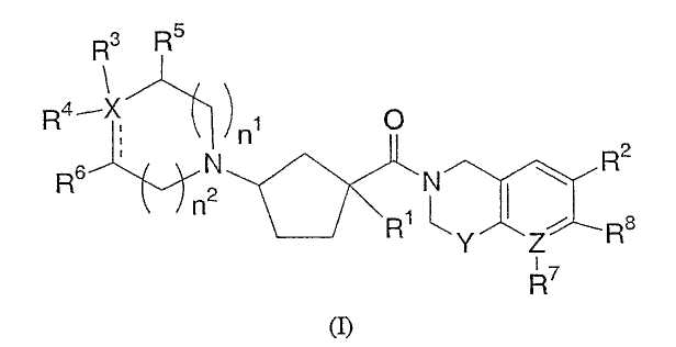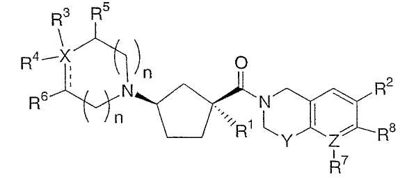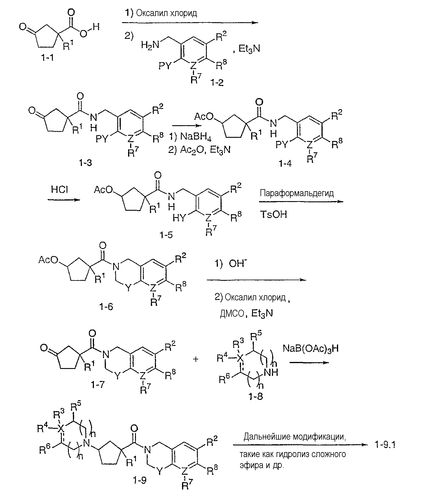 в которой Х обозначает С, N или О; Y обозначает О; Z обозначает С; R1 обозначает водород, -C0-6алкил-W-(C1-6алкил)-, -(С0-6алкил)-W-(С0-6алкил)-(С3-7циклоалкил)-(С0-6алкил), где алкил и циклоалкил необязательно являются замещенными 1-7 независимыми заместителями, выбранными из гидрокси, -O-C1-3алкила, трифторметила, C1-3алкила; W обозначает простую связь, -O-, -СО-, -CO2-, -CONR10– или -NR9-; R2 обозначает -С0-6алкил, С0-6алкил-W-С1-6алкил или С0-6алкил-W-С3-7циклоалкил, где C1-6алкил, С3-7циклоалкил необязательно являются независимо замещенными 1-6 заместителями, выбранными из галогена, трифторметила, -C1-6алкила; R3 обозначает водород, -(С0-6алкил)-фенил, -(С0-6алкил)гетероцикл, -(С0-6алкил)-С3-7циклоалкил, -(С0-6алкил)-СО2R10, -(С0-6алкил)-(алкен)-CO2R10, -(С0-6алкил)-SO3Н, -(С0-6алкил)-W-С0-4алкил, -CONR10R10 или -NR10CO2R10, NR10С0-3алкилСО2R10, где фенил и гетероцикл, циклоалкил или С0-6алкил являются необязательно замещенным 1-5 независимыми заместителями, выбранными из галогена, трифторметила, гидрокси, C1-3алкила, -О-С0-3СО2R10, CN, =O, -NR10R10, -CONR10R10, SO3R10 или -(С0-3алкил)гетероцикл, и где фенил может быть сконденсирован с гетероциклом, который сам необязательно может быть замещенным 1-2 гидроксильными группами; R4 отсутствует, если Х представляет О или N, или если двойная связь соединяет атомы углерода, к которым присоединены R3 и R6, или R4 обозначает гидрокси, С0-6алкил, CN, -С0-3СО2R10, или R3 и R4 объединены вместе, образуя 1H-инденил, 2,3-дигидро-1Н-инденил, циклопентанильное или циклогексанильное кольцо, где данный полученный цикл необязательно является замещенным 1-5 заместителями, независимо выбранными из гидрокси, C1-3алкила, -O-C1-3алкила и -С0-3СО2R10, или R3 и R5 или R4 и R6 объединены вместе, образуя фенил или гетероциклильное кольцо, где данное кольцо является необязательно замещенным 1-7 независимыми заместителями выбранными из гидрокси, C1-3алкила, -O-C1-3алкила, -CO2R10; R5 и R6 независимо обозначают водород, гидрокси, C1-6алкил или С0-6алкил-СО2R10; если Z=C, R7 обозначает водород, C1-6алкил; R8 обозначает водород; R10 обозначает водород, -C1-6алкил, бензил, фенил или -С0-6алкил-С3-6циклоалкил; n1 и n2 независимо равны 0, 1 или 2, причем сумма n1 и n2 равна 0, 1, 2 или 3; пунктирная линия представляет простую связь или двойную связь, а также к другим соединениям этого ряда; фармацевтической композиции, модулирующей активность хемокиновых рецепторов, способу модуляции активности хемокиновых рецепторов у млекопитающих, а также к способу лечения, улучшения, регулирования или снижения риска воспалительного и иммунорегуляторного нарушения или заболевания. Технический результат – получены новые соединения, обладающие полезными биологическими свойствами. 12 н. и 9 з.п. ф-лы, 4 табл.