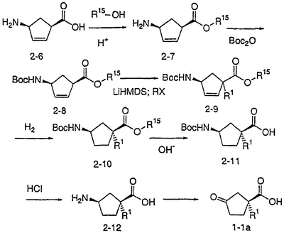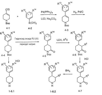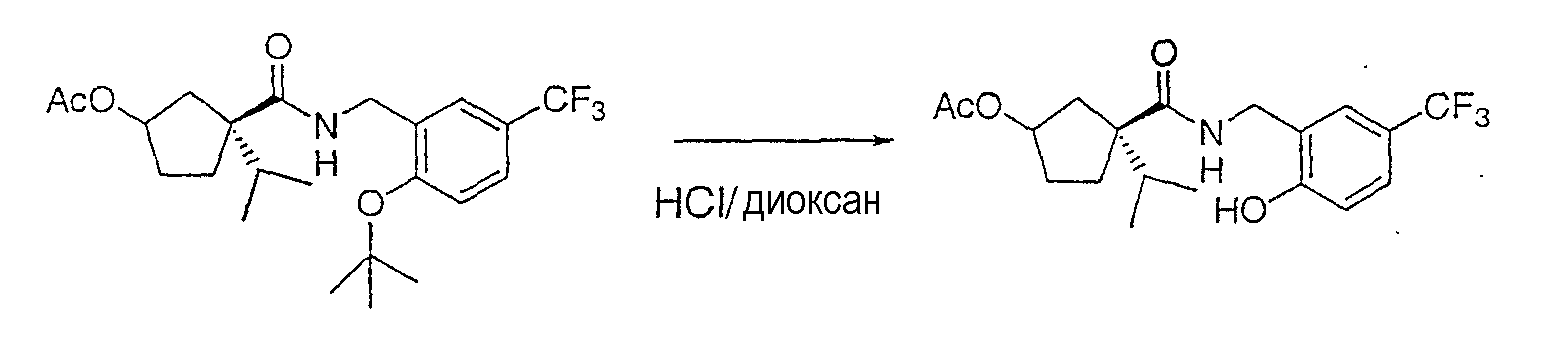 Реакционную колбу повторно откачивают и продувают газообразным водородом (3x). Затем реакционную смесь перемешивают в течение 5 час при к.т. под баллонным водородом. Завершение взаимодействия определяют методом ВЭЖХ/MS, фильтруют и концентрируют в вакууме. Очистка методом ВЭЖХ с обращенной фазой, затем обработка 1,0 M HCl в диэтиловом эфире дают HCl-соль требуемой кислоты. ЭСИ-МС: рассчитано для C26H36F3N3O4 511,58; найдено 512 (M+H).