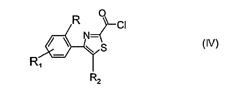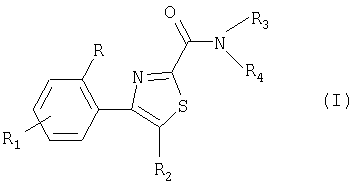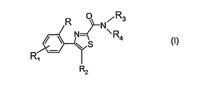 где R представляет галоген; R1 представляет атом водорода или атом галогена; R2 представляет фенильную группу, которая может быть замещена 1-4 атомами галогена или трифторметильными группами; R3 представляет атом водорода, или разветвленную или неразветвленную C1-3 алкильную группу; R4 представляет разветвленную или неразветвленную C1-10 алкильную группу, разветвленную или неразветвленную C1-10 алкоксигруппу, С3-8 циклоалкил, C5-10 бициклоалкил, которые могут быть замещены гидроксигруппой, 1-3 метильными группами, этильной группой или 1-3 атомами фтора, или R4 представляет C5-7 циклоалкильную группу, которая содержит N и/или О в качестве гетероатома, или C5-10 бициклоалкил, включающий N в качестве гетероатома, причем все эти группы могут быть замещены гидроксигруппой, 1-3 метильными группами, этильной группой или 1-3 атомами фтора, или R4 представляет бензильную группу, которая может быть замещена 1-5 заместителями, выбранными из галогена или трифторметила, и его стереоизомеры и фармацевтически приемлемые соли. 2. Соединение по п.1, представляющее собой 5-(4-хлорфенил)-4-(2,4-дихлорфенил)-N-(1-пиперидинил)тиазол-2-карбоксамид; 5-(4-хлорфенил)-N-циклогептил-4-(2,4-дихлорфенил)тиазол-2-карбоксамид; 5-(4-хлорфенил)-N-циклопентил-4-(2,4-дихлорфенил)тиазол-2-карбоксамид; 5-(4-хлорфенил)-4-(2,4-дихлорфенил)-N-(транс-4-гидроксициклогексил)тиазол-2-карбоксамид; 5-(4-хлорфенил)-4-(2,4-дихлорфенил)-N-(2-метилциклогексил)тиазол-2-карбоксамид; 5-(4-хлорфенил)-4-(2,4-дихлорфенил)-N-(4-фторбензил)тиазол-2-карбоксамид; 5-(4-хлорфенил)-4-(2,4-дихлорфенил)-N-(транс-4-метилциклогексил)тиазол-2-карбоксамид; 5-(4-хлорфенил)-N-(цис-4-метилциклогексил)-4-(2,4-дихлорфенил)тиазол-2-карбоксамид; N-(трет-бутокси)-5-(4-хлорфенил)-4-(2,4-дихлорфенил)тиазол-2-карбоксамид; 5-(4-хлорфенил)-4-(2,4-дихлорфенил)-N-(н-пентил)тиазол-2-карбоксамид; 5-(4-хлорфенил)-N-циклогексил-4-(2,4-дихлорфенил)тиазол-2-карбоксамид; 4-(2,4-дихлорфенил)-N-(1-пиперидинил)-5-(4-(трифторметил)фенил)тиазол-2-карбоксамид; N-циклогексил-4-(2,4-дихлорфенил)-5-(4-(трифторметил)фенил)тиазол-2-карбоксамид; 4-(2,4-дихлорфенил)-N-(экзо-бицикло[2.2.1]гепт-2-ил)-5-(4- (трифторметил)фенил)тиазол-2-карбоксамид; 4-(2,4-дихлорфенил)-N-(4-морфолинил)-5-(4-(трифторметил)фенил)тиазол-2-карбоксамид; 5-(4-бромфенил)-4-(2,4-дихлорфенил)-N-(н-пентил)тиазол-2-карбоксамид; 5-(4-бромфенил)-4-(2,4-дихлорфенил)-N-(гексагидро-(1Н)азепин-1-ил)тиазол-2-карбоксамид; 5-(4-хлорфенил)-4-(2,4-дихлорфенил)-N-(морфолин-4-ил)тиазол-2-карбоксамид; 5-(4-хлорфенил)-4-(2,4-дихлорфенил)-N-(пирролидин-1-ил)тиазол-2-карбоксамид; 5-(4-хлорфенил)-4-(2,4-дихлорфенил)-N-(гексагидро(1Н)азепин-1-ил)тиазол-2-карбоксамида; 5-(4-хлорфенил)-4-(2,4-дихлорфенил)-N-(гексагидроциклопента-[с]пиррол-2(1Н)-ил)тиазол-2-карбоксамид; N-бензил-5-(4-хлорфенил)-4-(2,4-дихлорфенил)-N-метил-тиазол-2-карбоксамид; 5-(4-хлорфенил)-4-(2,4-дихлорфенил)-N-(4-трифторметил)бензил)тиазол-2-карбоксамид; 5-(4-хлорфенил)-4-(2,4-дихлорфенил)-N-(экзо-бицикло[2.2.1]гепт-2-ил)тиазол-2-карбоксамид; 5-(4-хлорфенил)-4-(2,4-дихлорфенил)-N-(эндо-бицикло[2.2.1]гепт-2-ил)тиазол-2-карбоксамид; 4-(2,5-дихлорфенил)-N-(экзо-бицикло[2.2.1]гепт-2-ил)-5-(фенил)тиазол-2-карбоксамид; N-(циклогексил)-4-(2,5-дихлорфенил)-5-(фенил)тиазол-2-карбоксамид; 5-(4-хлорфенил)-4-(2,4-дихлорфенил)-N-(тетрагидро-2Н-пиран-2-илокси)тиазол-2-карбоксамид; 5-(4-хлорфенил)-4-(2,4-дихлорфенил)-N-(5,5,5-трифторпентил)тиазол-2-карбоксамид; 5-(4-хлорфенил)-4-(2,4-дихлорфенил)-N-(2-фторэтил)тиазол-2-карбоксамид; 5-(4-хлорфенил)-4-(2,4-дихлорфенил)-N-(5-фторпентил)тиазол-