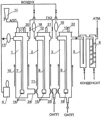 В дальнейшем сущность изобретения поясняется описанием и чертежом, на котором представлена технологическая схема установки. Установка включает три реактора окисления АПП 1, 2, 3, компрессор 4 для получения сжатого воздуха (0,8 МПа) и два холодильника-сепаратора 5, 6 для отделения низкомолекулярных продуктов деструкции. Каждый реактор 1, 2, 3 окисления АПП состоит из стального корпуса с внутренним диаметром 410 мм, высотой 1200 мм, барботеров 7, 8, 9, воздушных электронагревателей 10 и герметичной крышки реактора 11, 12, 13. Электронагреватели 10, размещенные на наружной стенке реакторов, защищены от теплопотерь в окружающую среду тепловой высокотемпературной изоляцией, покрытых сверху обечайкой (на чертеже не показана). На конце каждого барботера 7, 8, 9 закреплена съемная диспергирующая насадка 14, 15, 16 с внутренним диаметром 102 мм и вертикальными прорезями по периметру нижней кромки высотой 15 мм. На входе каждого барботера 7, 8, 9 установлены расходомеры 17, 18, 19. Каждый из реакторов окисления 1, 2, 3 снабжен аварийным клапаном 20, 21, 22 и датчиком температуры с терморегулятором (на чертеже не показаны). Реактор 1 снабжен загрузочным бункером 23 для дозированной подачи исходного АПП. Для заполнения реакторов 2 и 3 предусмотрены переливные патрубки 24, 25.