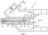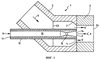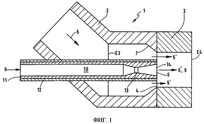 На фиг.1 в схематичном разрезе изображено инжекторное устройство 1, согласно изобретению, которое в изображенном примере выполнения состоит в основном из загнутого патрубка 2 для горячего газа, в который сбоку вставлен кислородный инжектор 10. Кислородный инжектор 10 вставлен при этом преимущественно так, что продольная ось горизонтальной части инжекторного устройства 1 совпадает с продольной осью кислородного инжектора 10. На своем переднем конце – на чертеже справа – проходной диаметр патрубка 2 сужен за счет проходящего наискось внутрь конфузора 7 настолько, что патрубок 2 образует с кислородным инжектором 10 в этой зоне концентричное сопло 4 с кольцевой щелью или аналогичное конструктивное решение с сопоставимым действием (ниже для простоты называемое соплом с кольцевой щелью).