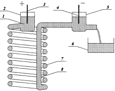 Устройство для очистки жидких металлов, преимущественно кремния, содержит: 1 – очищаемый металл, 2 – емкость для исходного металла, 3, 4 – электроды, 5 – емкость для очищенного металла, 6 – кристаллизатор для очищенного металла, 7 – канал, выполненный в виде спирали, 8 – нагреваемая соединительная трубка.