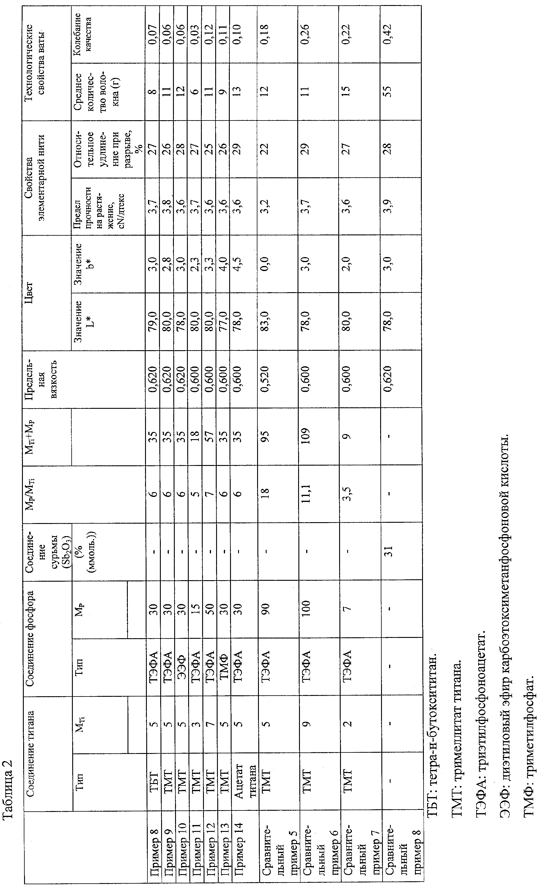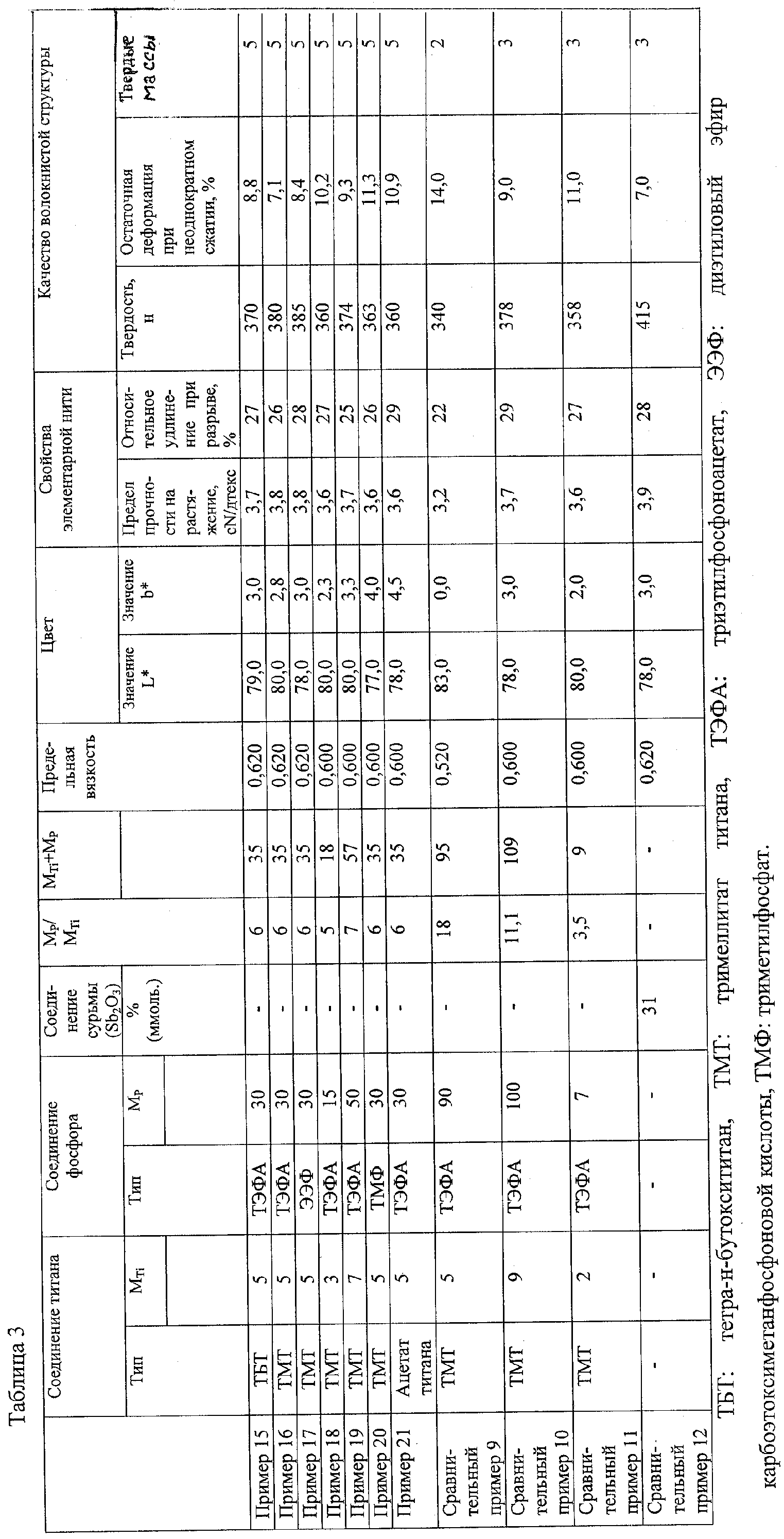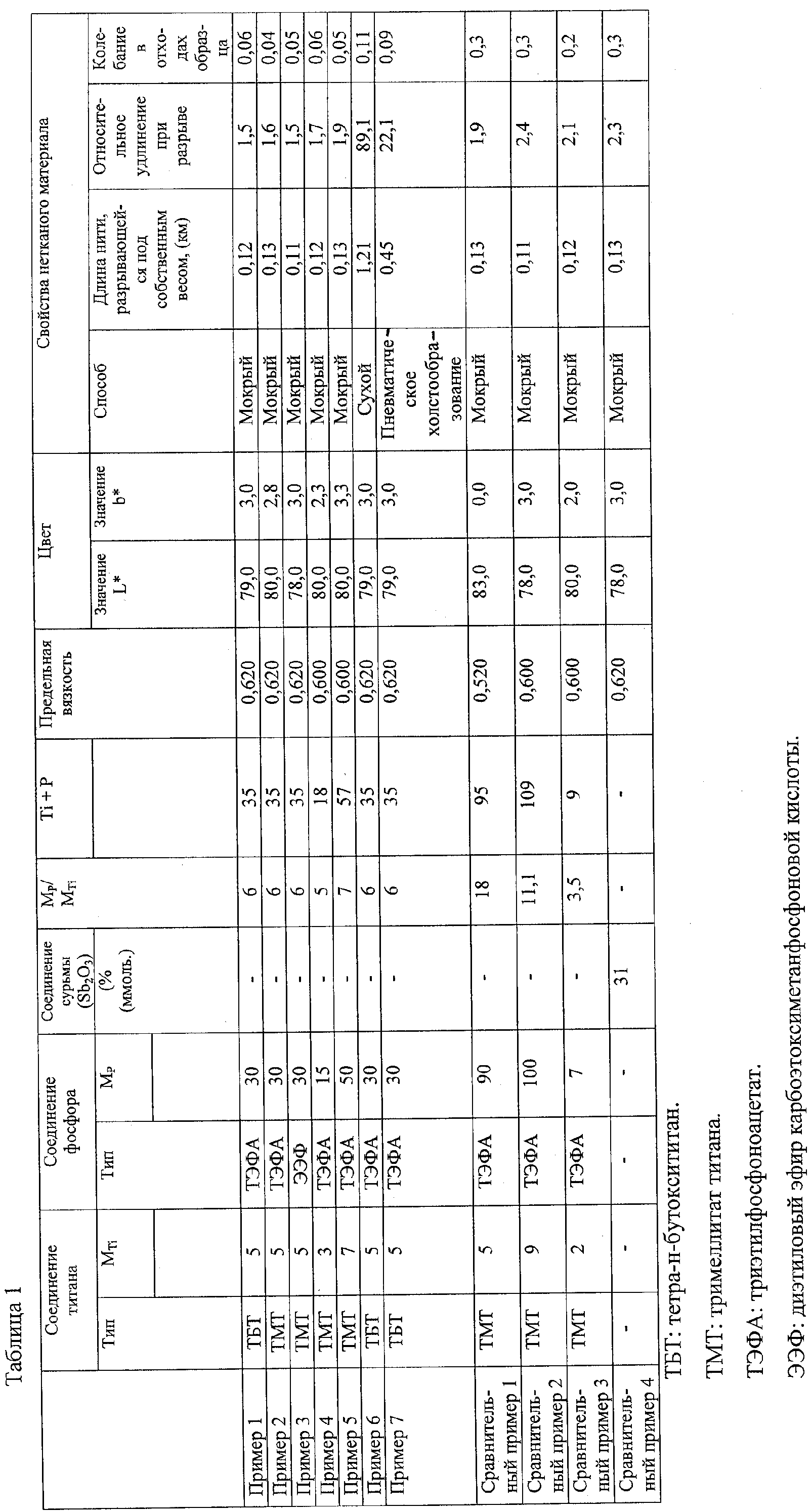 Пример 32 Гранулы из того же самого полиэтилентерефталата, что и в примере 22, по обычному способу высушивали и использовали для получения штапельных волокон из сложного полиэфира с массовым номером одиночного волокна 12 дтекс, 8 извитками/25 мм и степенью извитости 30%. Те же самые гранулы также использовали в качестве компонента ядра, в то время как тот же самый катализатор использовали для полимеризации смешанного кислотного компонента, включающего терефталевую кислоту и изофталевую кислоту с соотношением 80/20 (в мольных процентах), и бутиленгликоля, и получаемый терефталат на основе полибутилена дополнительно подвергали реакции при нагревании с полибутиленгликолем (молекулярная масса 2000) при соотношении количеств обоих реагентов 38 мас.%: 62 мас.% и получали блок-сополимерный эластомерный полиэфироэфир на основе простых и сложных эфиров (термопластичный эластомер) с предельной вязкостью 1,0 и температурой плавления 155°С, который использовали в качестве компонента оболочки. При соотношении площадей в поперечном сечении волокна со структурой «ядро/оболочка» 60/40 проводили формование волокна, вытяжку, резку и тому подобное и получали сопряженное штапельное волокно из сложных полиэфиров (соотношение ядро/оболочка 60/40, массовый номер волокна 6 дтекс, 11 завитков/25 мм, степень извитости 8%). Штапельное волокно из сложного полиэфира и получаемое по способу термосоединения сопряженное штапельное волокно из сложных полиэфиров перемешивали с массовой пропорцией 70:30 и два раза пропускали через валичную чесальную машину с получением смешанного полотна. Полотно помещали в формующую рамку при установленной плотности и подвергали термообработке при 180°С×15 мин при использовании сушилки с обогревом циркулирующим горячим воздухом, получали волокнистую структуру с плотностью 0,04 г/см3 и толщиной 5 см. Проводили оценку свойств получаемой волокнистой структуры, и результаты продемонстрированы в таблице 6. Пример 33 Реализовывали ту же самую методику, что и в примере 32, за исключением того, что вместо монолаурилфосфата использовали монобутилфосфат. Добавляемое количество и условия также изменили следующим образом. После нагревания и растворения 28,3 г монобутилфосфата в 537 г этиленгликоля (что здесь и далее в настоящем документе сокращенно называется «раствором Р2») сюда помещали 435 г раствора ТВ и получали продукт реакции. Соотношение концентраций компонентов в смеси для раствора ТВ и раствора Р2 составляло 2,0, представляя собой молярное соотношение между атомами фосфора и атомами титана. Данный раствор здесь и далее в настоящем документе будут сокращенно называть «катализатором ТР2-2,0». Температура нагревания была равна 70°С, а время реакции составляло 1 час. Для того чтобы проанализировать полученный в реакции осадок, часть раствора реакционной смеси отфильтровывали при использовании фильтра с порами 5 мкм и получали выпавший в осадок продукт реакции в виде твердой фазы, а после этого его промывали при помощи воды и высушивали. Концентрацию элементов в полученном выпавшем в осадок продукте реакции анализировали тем же самым образом, что и ранее, получая в результате 17,0% титана, 21,2% фосфора и молярное соотношение между атомами фосфора и атомами титана, равное 1,9. Катализатор использовали для получения волокна из сложного полиэфира тем же