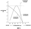 На фиг.4 показан график, описывающий характеристики устройства 18 обнаружения вибрации. График показывает связь между вертикальным перемещением вала 24 из эталонного положения и вторичным напряжением для каждой вторичной катушки, причем входное напряжение первичной катушки является устанавливаемой постоянной, и вал 24, включающий тело 20 магнита, двигается вверх (направление удлинения) и вниз (направление сжатия).