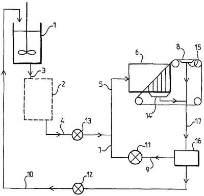 На фиг.1 схематически показан способ непрерывного производства мата после изготовления рубленых прядей. Рубленые пряди вводят в мешалку 1 и перемешивают с оборотной водой до содержания рубленых прядей в смеси рубленых прядей и оборотной воды от 0,5 до 10 вес.% и в основном от 1 до 5 вес.%. По выбору, смесь затем по трубопроводу 5 сливают в резервуар для хранения 2, назначение которого состоит в увеличении продолжительности перемешивания прядей и оборотной воды. Этот резервуар для хранения является необязательным. Затем смесь по трубопроводу 4 стекает к трубопроводу 5, в котором объединяется поток смеси, поступающий по трубопроводу 4, с потоком рециркулирующей оборотной воды, поступающей из напорного ящика 6 по трубопроводу 7. В этот момент значительно уменьшается содержание стеклянных прядей в смеси прядей и оборотной воды, например, приблизительно в 10 раз. Оборотная вода сливается в 14 и, по выбору, отсасывается в 15 через формовочную сетку 8 и рециркулирует по трубопроводу 17. Эта рециркулирующая вода затем разделяется в 16, например, около 10% воды возвращается в мешалку по трубопроводу 10, а около 90% воды возвращается в напорный ящик 6 по трубопроводам 9, 7 и затем по трубопроводу 5. Циркуляция по трубопроводам обеспечивается насосами 11, 12 и 13. Насос 11 – это лопастной насос. На фиг.1 не показаны последующие, более обычные стадии нанесения связующего и термообработки. Мат может быть высушен и термообработан в сушилке с циркуляцией горячего воздуха через ленту.