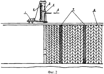 На фиг.2 представлен разрез ПФЗ с фильтрующими окнами: 1 – ПФЗ; 2 – фильтрующие окна; 3 – лебедка; 4 – копер; 5 – вибропогружатель; 6 – подача раствора; 7 – погружаемый элемент.