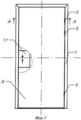 Изобретение поясняется чертежами, где на фиг.1 изображена дверь, фронтальная проекция; на фиг.2 – вид А на фиг.1.