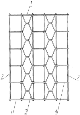 На чертеже показан общий вид решетки, где 1 – опорные элементы, 2 – стержни, 3 – звенья с отверстиями для пропуска в них стержней, 4 – поперечины с отверстиями для пропуска в них стержней.