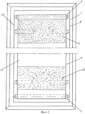 Однако для обеспечения работы шторки 5 в таком режиме целесообразно дополнительно использовать дополнительные опоры 15 и 16. Это обусловлено тем, что для полного перекрытия остекления 3 полосами 11 и 12 необходимо полностью убрать участки 13 и 14 шторки в промежутки между роликами 8 соответствующих пар 6 и 7, но учитывая, что величина этих промежутков является ограниченной и зависит от расстояния между рамами 1 и 2, то разместить участки 13 и 14 шторки в указанных промежутках не представляется возможным. С этой целью в конструкцию оконного блока и введены дополнительные свободно вращающиеся опоры 15 и 16, огибаемые шторкой 5.